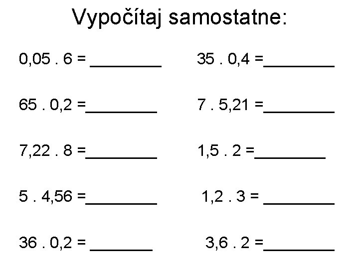 . 10 t . 100 q . 100 kg . 1000 dag g : 1000 m g Previerka – premena jednotiek A 8 t =. . . kg 4 kg=. . . g 35 q=. . . t 500 g=. . . dag 1, 23 mg=. . . g 4, 5 m =. . . . cm 2, 03 cm=. . . . m 1023 mm=. . . dm 1, 2 km =. . . m 10 dm=. . . . cm Previerka – premena jednotiek B 12 t=. . . . kg 3, 5 kg=. . . . g 120 q=. . . . t 405 g=. . . . dag 0, 63 mg=. . . g 0, 028 m=. . . . cm 2654 cm=. . . . . m 98, 65 mm=. . . . dm 0, 76 km=. . . . . m 100 m=. . . . . cm