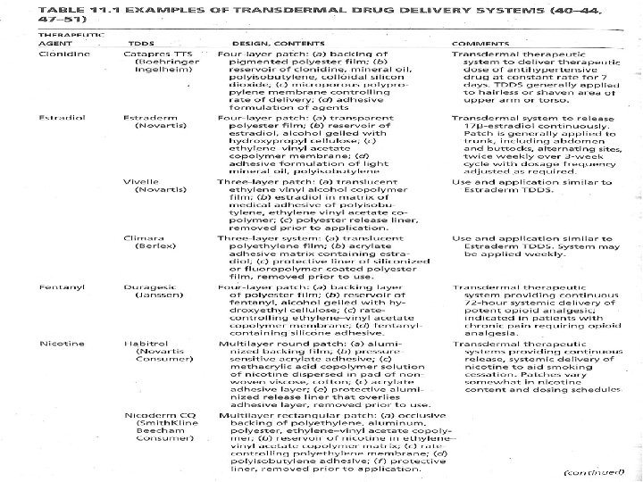 The disadvantages of TDDSs are: 1. Only relatively potent drugs are suitable candidates for transdermal delivery due to the natural limits of drug entry imposed by the skin’s impermeability. (由于皮肤的不透过性,仅有部分活性大的药物适 合制成经皮给药。) 2. Some patients may develop contact dermatitis at the site of application due to one or more of the system components, necessitating discontinuation. (一些病人在用药部位可产生接触性皮炎,无法继 续用药。)