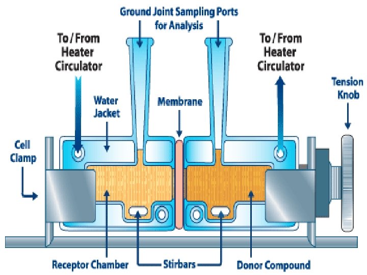 The material may be used in cell culture studies or in standard diffusion cells. n Diffusion cell systems are employed in vitro to quantify the release rates of drugs from topical preparations. n In these systems, skin membranes or synthetic membranes may be employed as barriers to the flow of drug and vehicle to simulate the biologic system. n