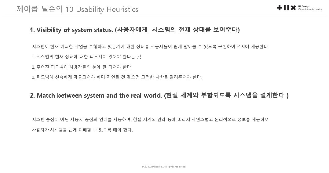 - 휴리스틱 평가 - 제이콥 닐슨의 10 Usability Heuristics - 벤 슈나이더맨(Ben Shneiderman)의 8 Golden Rules of Interface Design - Tailored Checklist of One Example © 2012 H 9 works. All rights reserved