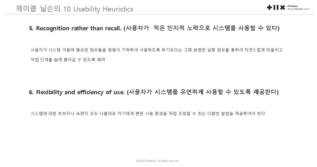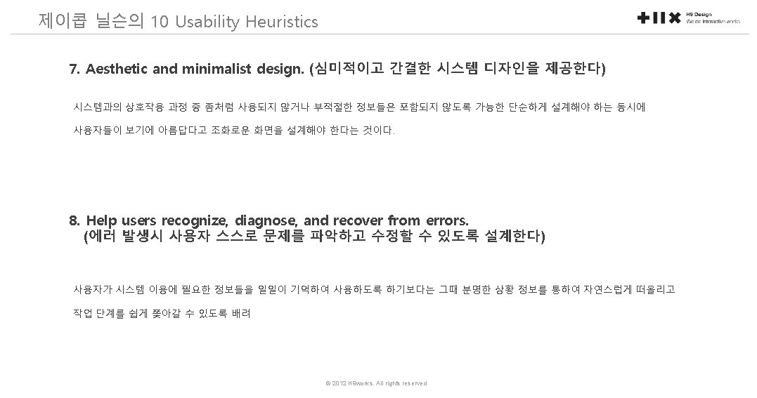 벤 슈나이더맨(Ben Shneiderman)의 8 Golden Rules of Interface Design 7. Support internal locus of control. (내적 통제감) 경험있는 사용자들은 시스템에 대한 통제를 하고 있다는 느낌을 느끼기를 바란다. 그리고 그 시스템이 그들의 작용에 반응하기를 희망한다. 사용자를 단순 반응자보다 작용의 시작자로 만들도록 디자인하라. Experienced operators strongly desire the sense that they are in charge of the system and that the system responds to their actions. Design the system to make users the initiators of actions rather than the responders. 8. Reduce short-term memory load. 단기 기억에 있는 인간 정보처리의 제한으로, 여러 페이지 화면을 간단하고 여러 페이지를 일관성있게 표현해 주기를 원한다. The limitation of human information processing in short-term memory requires that displays be kept simple, multiple page displays be consolidated, © 2012 H 9 works. All rights reserved