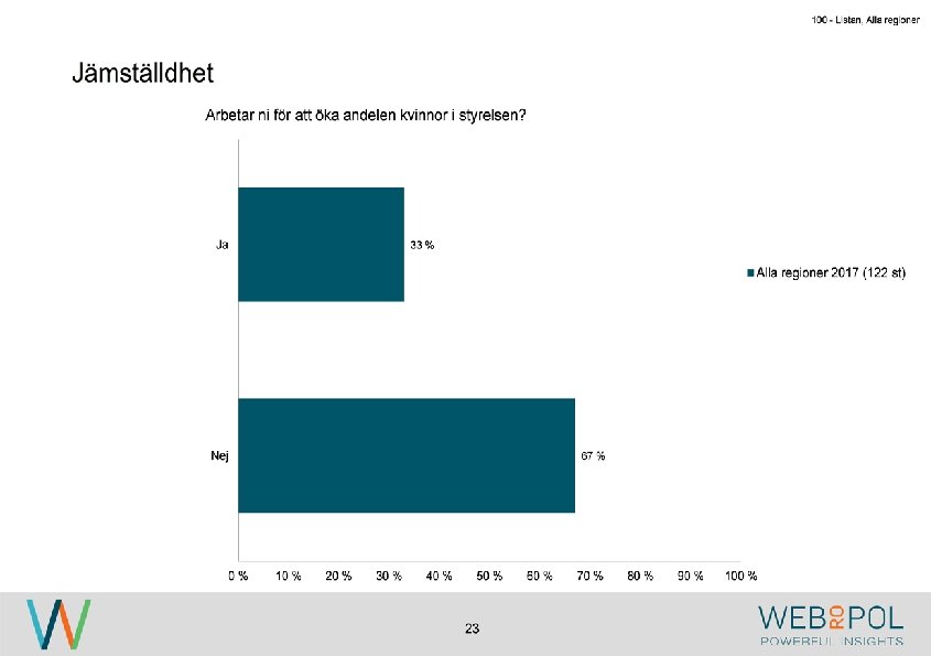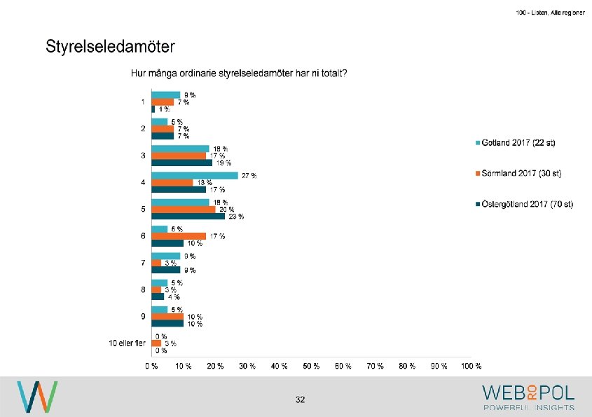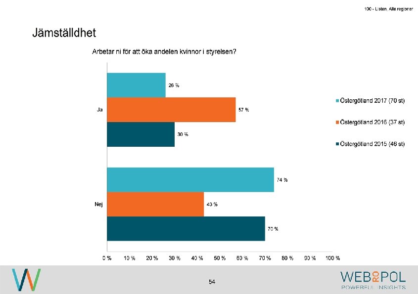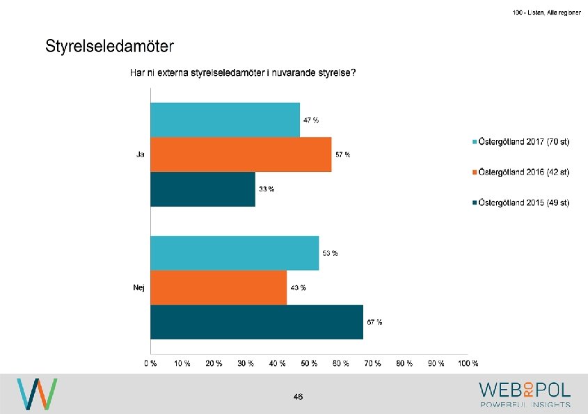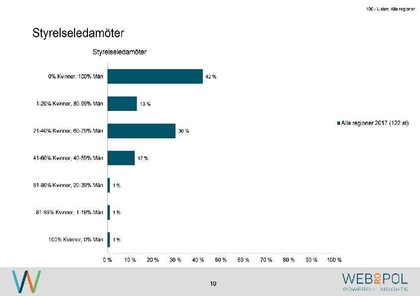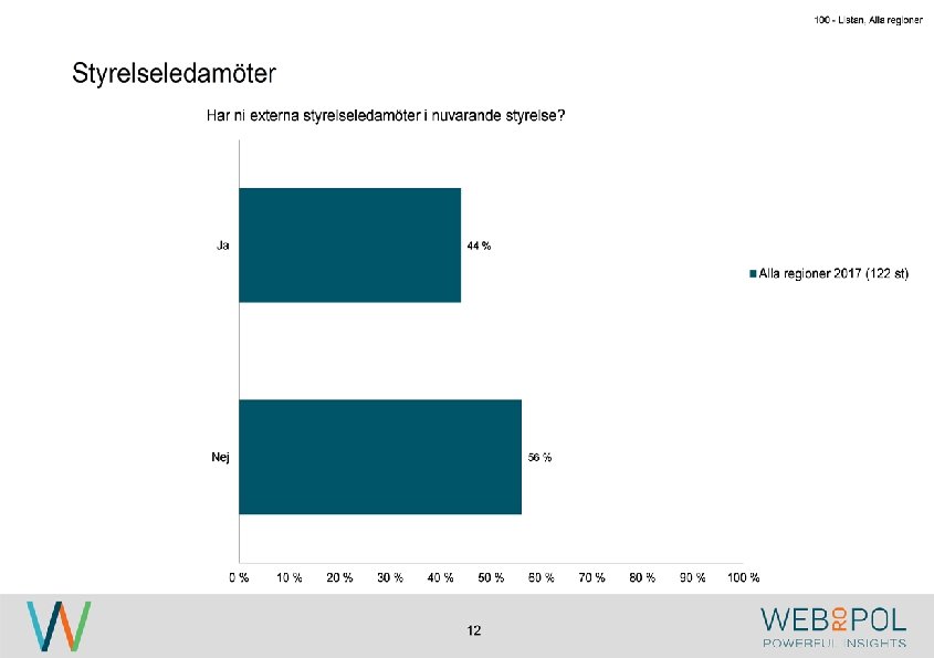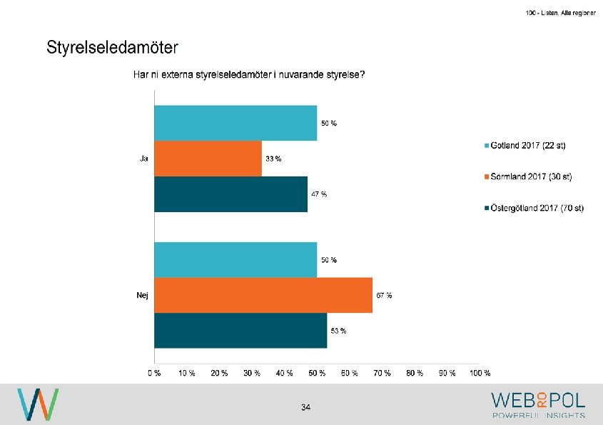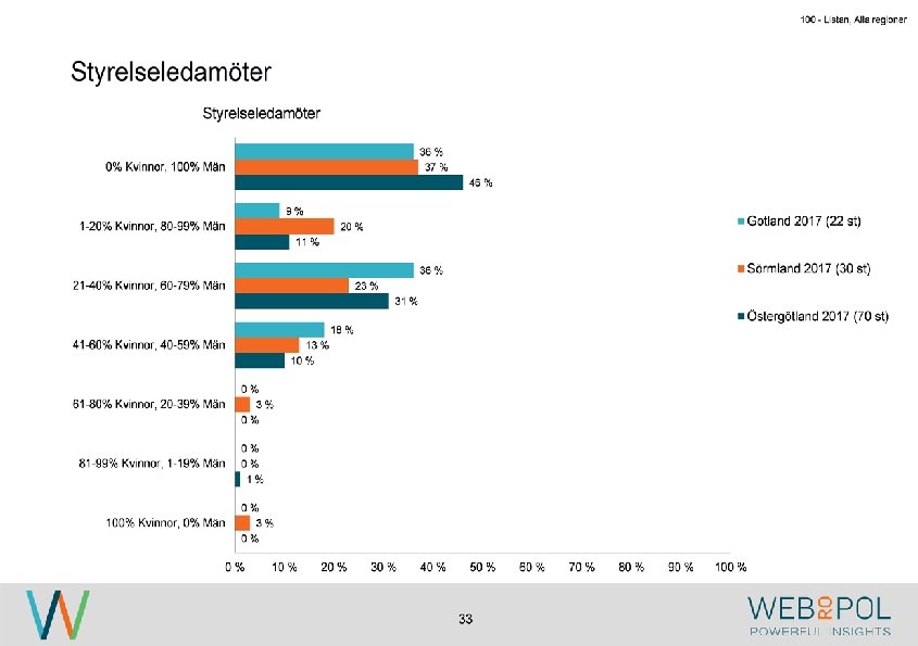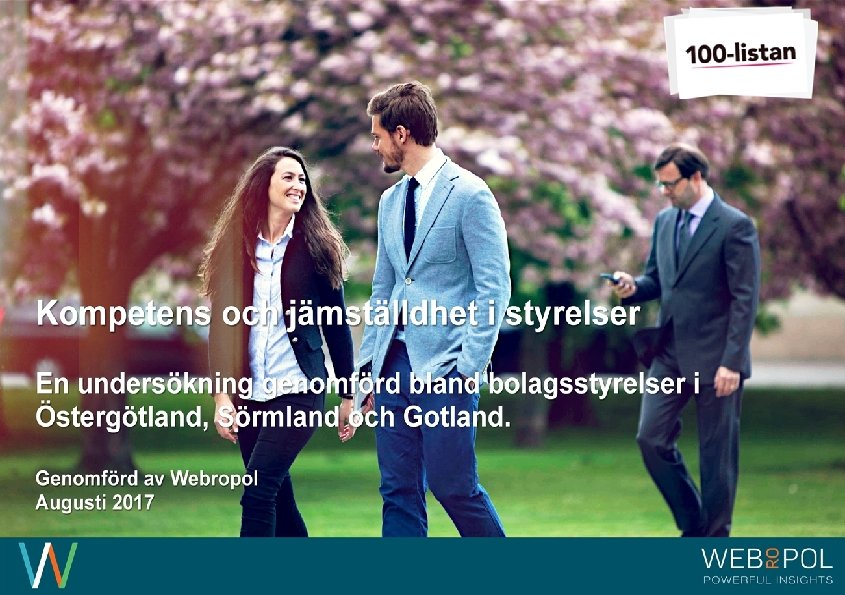 100 - Listan, Alla regioner Information om undersökningen Syfte Webropol har under maj-augusti 2017 genomfört en undersökning på uppdrag av Östsvenska Handelskammaren. Syftet med undersökningen är att ta reda på hur jämställdheten ser ut i företagsstyrelser belägna på Gotland, i Sörmland och Östergötland. Datainsamling Undersökningen genomfördes som en webbenkät med 5 påminnelser och 3 kontaktförsök har gjort till varje respondent via telefon. Totalt var det 122 av 343 personer som besvarade enkäten, vilket ger en svarsfrekvens på 36 procent. Webbenkäten skickades ut onsdag den 17/5 därefter skickades påminnelser ut den 24/5, 31/5, 9/6, 9/8, och 15/8. Josefin Linebäck har varit projektledare och har tillsammans med Petra Rudholm och Jonatan Johansson genomfört analysen. Anna Axelsson har varit ansvarig på Östsvenska Handelskammaren. Svarsfrekvens Antal utskick 343 Utskicksdag (17/5) Onsdag Innan P 1 (24/5) 10% Innan P 2 (31/5) 16% Innan P 3 (9/6) 20% 3 Innan P 4 (9/8) 31% Innan P 5 (15/8) 33% Slutlig 36%