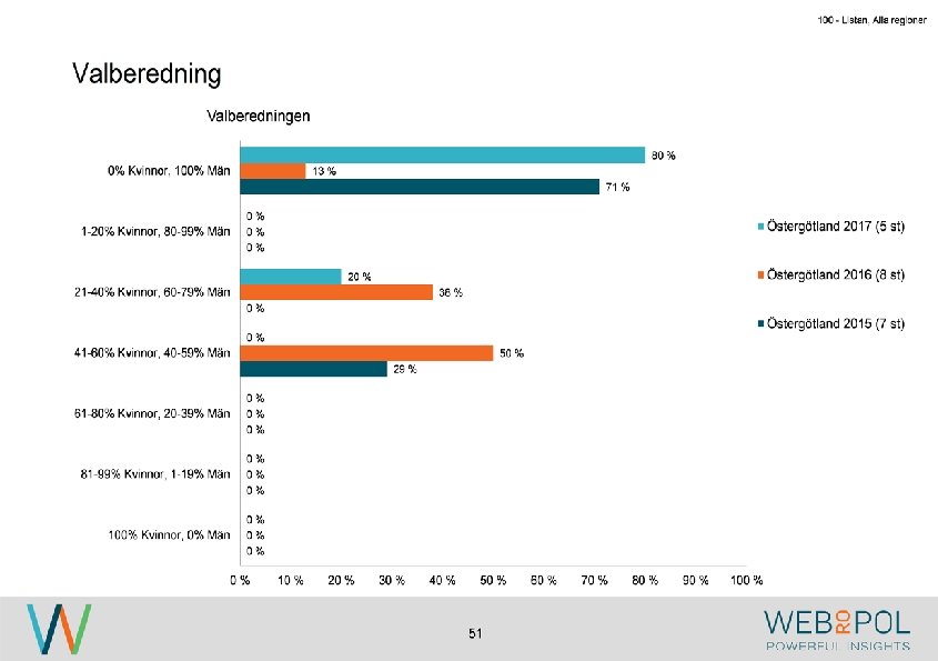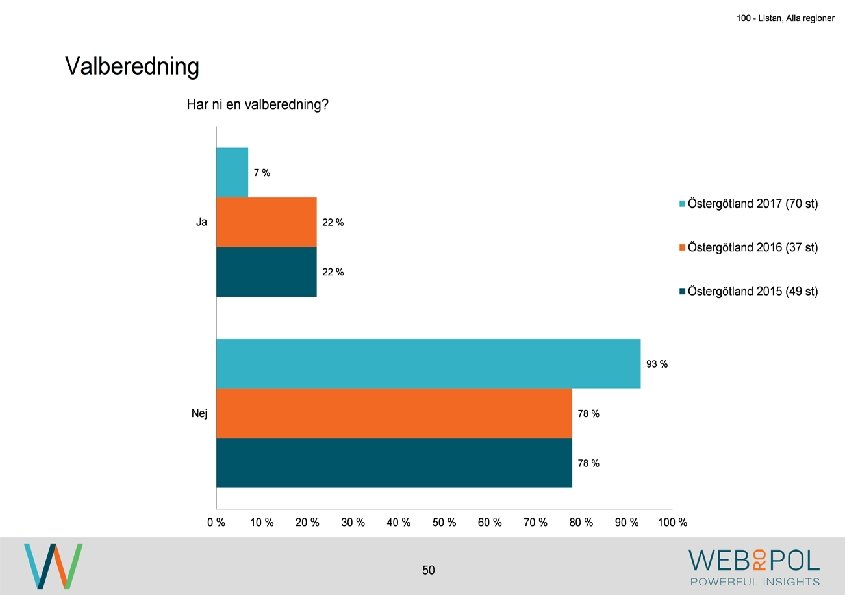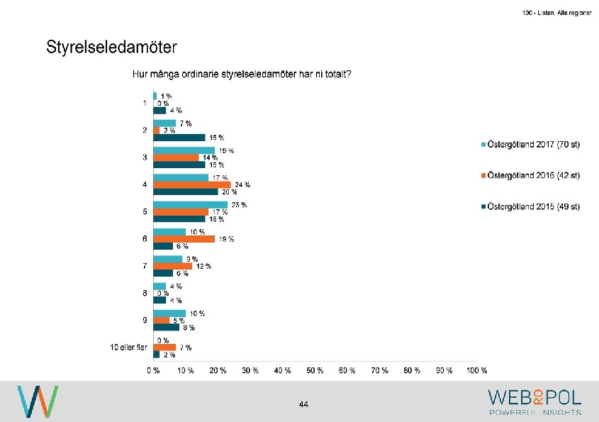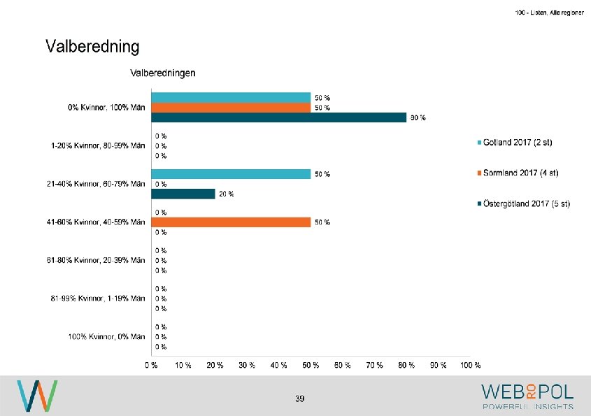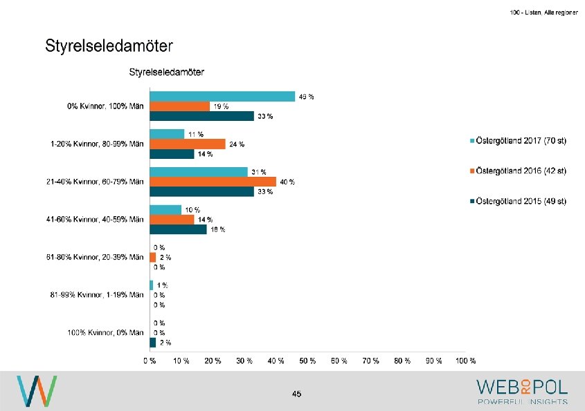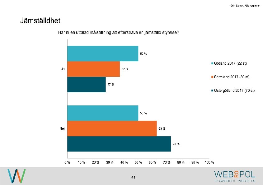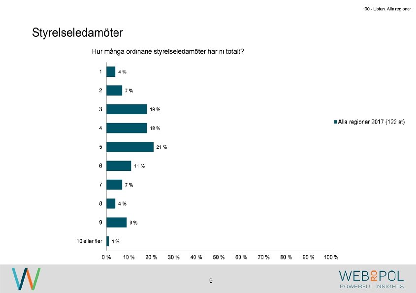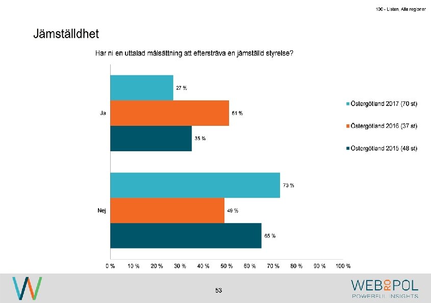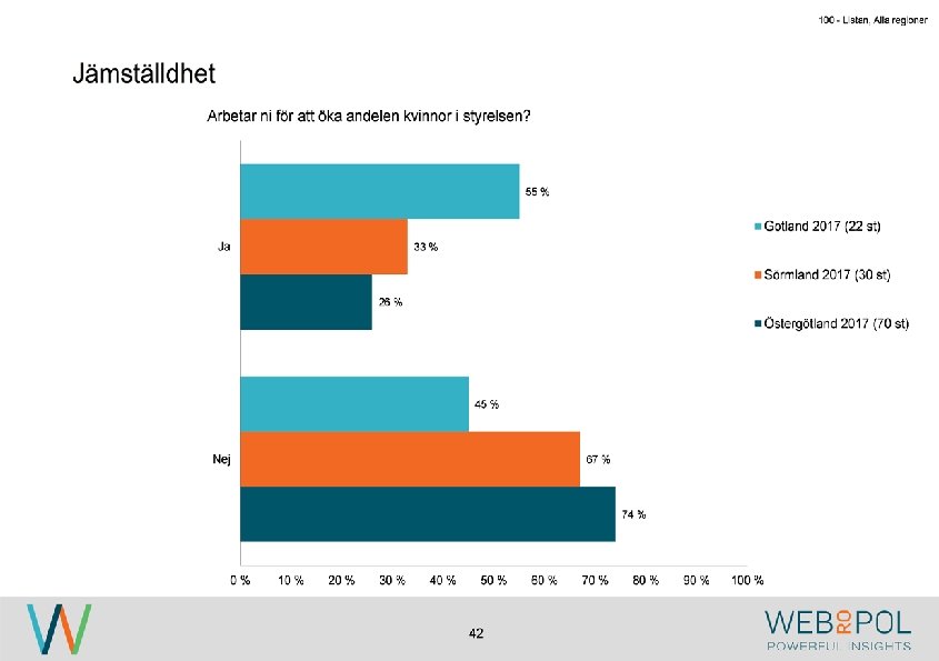 100 - Listan, Alla regioner Information om undersökningen Syfte Webropol har under maj-augusti 2017 genomfört en undersökning på uppdrag av Östsvenska Handelskammaren. Syftet med undersökningen är att ta reda på hur jämställdheten ser ut i företagsstyrelser belägna på Gotland, i Sörmland och Östergötland. Datainsamling Undersökningen genomfördes som en webbenkät med 5 påminnelser och 3 kontaktförsök har gjort till varje respondent via telefon. Totalt var det 122 av 343 personer som besvarade enkäten, vilket ger en svarsfrekvens på 36 procent. Webbenkäten skickades ut onsdag den 17/5 därefter skickades påminnelser ut den 24/5, 31/5, 9/6, 9/8, och 15/8. Josefin Linebäck har varit projektledare och har tillsammans med Petra Rudholm och Jonatan Johansson genomfört analysen. Anna Axelsson har varit ansvarig på Östsvenska Handelskammaren. Svarsfrekvens Antal utskick 343 Utskicksdag (17/5) Onsdag Innan P 1 (24/5) 10% Innan P 2 (31/5) 16% Innan P 3 (9/6) 20% 3 Innan P 4 (9/8) 31% Innan P 5 (15/8) 33% Slutlig 36%