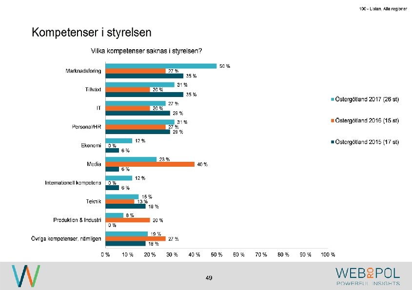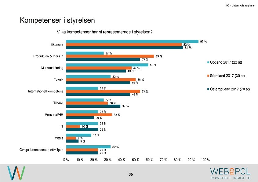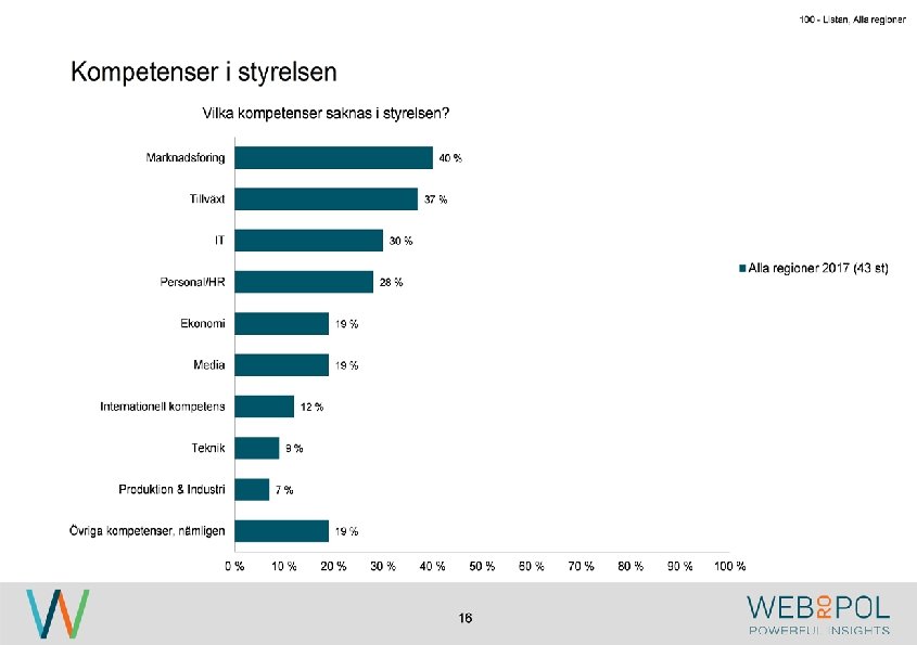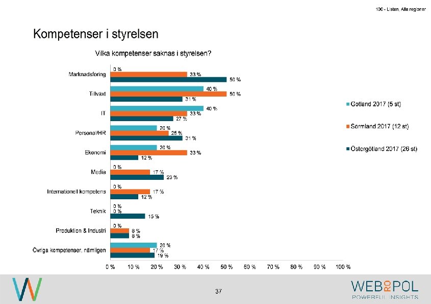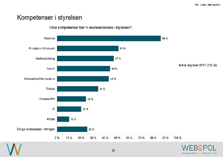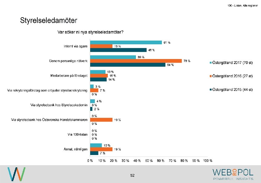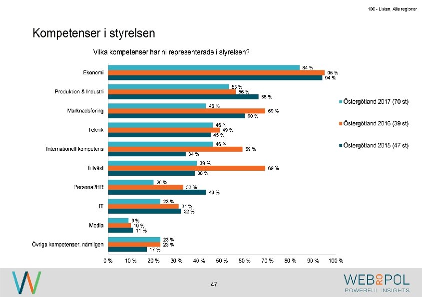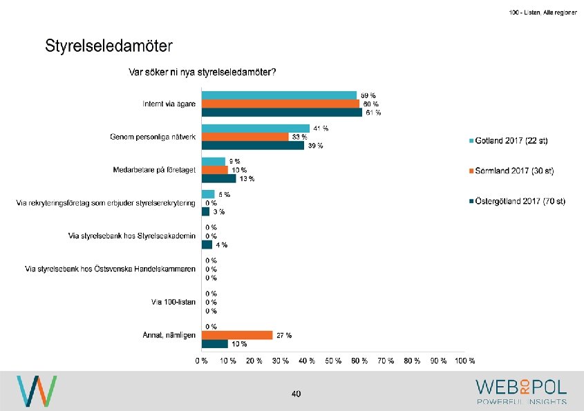 100 - Listan, Alla regioner Sammanfattning Om undersökningen Undersökningen genomfördes under maj-augusti 2017 som en webbenkät. Totalt besvarade 122 av 343 VD: ar enkäten, vilket ger en svarsfrekvens på 36 procent. Av de som inte svarat, har de flesta uppgett att det är på grund av tidsbrist. Av de företag som är representerade i årets undersökning så är det betydligt färre stora företag. Detta beror på att i årets undersökning så har man varit mer selektiv med att företagen skall ha sitt huvudkontor i någon av regionerna som undersöks. Detta skiljer sig från 2016 då flertalet företag med dotterbolag i Östergötland var inkluderade i undersökningen. Kvinnor är underrepresenterade i styrelseledamotposterna hos de tillfrågade företagen, och fördelningen ser liknande ut mellan samtliga regioner. Ekonomi är den mest frekvent representerade kunskapen hos styrelserna och marknadsföring är den kompetens som flest respondenter anger som saknad i styrelsen. Nya styrelseledamöter hittas vanligen ”internt via ägare” eller ”genom personliga nätverk”. Medan 0% har uppgett att de hittat nya styrelseledamot via ”styrelsebank hos Östsvenska Handelskammaren” och ”via 100 -listan”. Syftet med undersökningen är att ta reda på hur jämställdheten ser ut i företagsstyrelser. Övergripande resultat I 2017 års undersökning ser vi att de flesta VD: ar representerar små och medelstora företag och de flesta har en årsomsättning mellan 100 -499 mkr. De mest frekvent representerade branscherna är tillverkning, fastighet och byggbranschen. 4