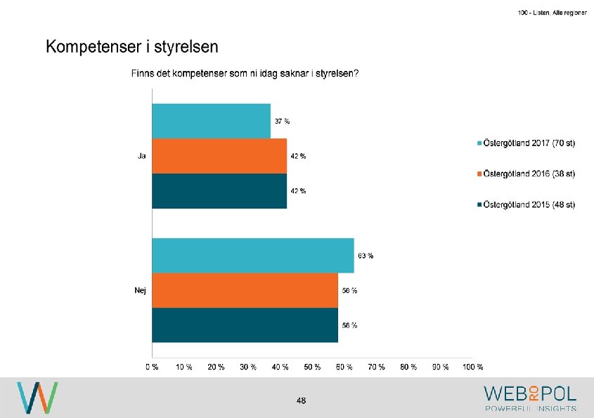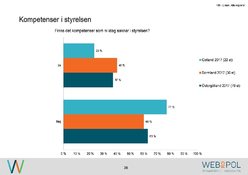 • Vi har en bra fördelning • vi är redan jämställda • Vi eftersträvar kompetens oavsett kön • Vi behöver ha fler män i styrelsen • Det är ingen prioriterad fråga för ägaren • Söker kompetens framför kön • Vi eftersträvar att ha rätt kompetens i styrelsen, detta oavsett om det är man eller kvinna. • koncernledning utgör styrelse i dotterbolag • Styrelserepr utses i en politisk process • Vi har redan majoriteten kvinnor • Politiskt styrd verksamhet • ägarna tillsätter stryrelsen • Kvinna eller man spelar ingen roll, det är viss kompetens vi söker vid rekrytering av ny styrelsemedlem. • Det är en intern styrelse, vi har 1/3 redan • För att styrelsen är jämställd idag. • 50% är redan kvinnor • Ser mer på kompetens än kön • Vi har inom koncernen inte någon specifik policy baserat på kön. • ha r balans • Kompetensen ska avgöra vem som ska sitta i styrelsen, inte kön. • Familjeföretag • Styrelsearbetet är egentligen inte aktivt alls. • Är en ägarfråga, styrelsen tillsätts av ägarrepresentanterna • Det är redan bra fördelning.