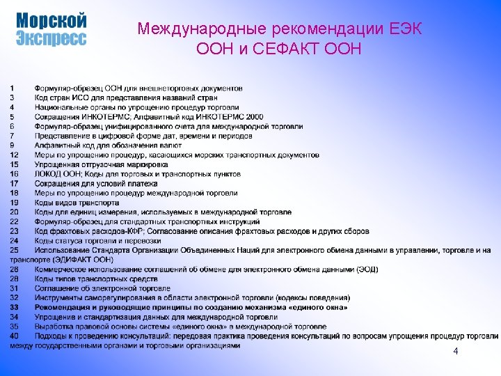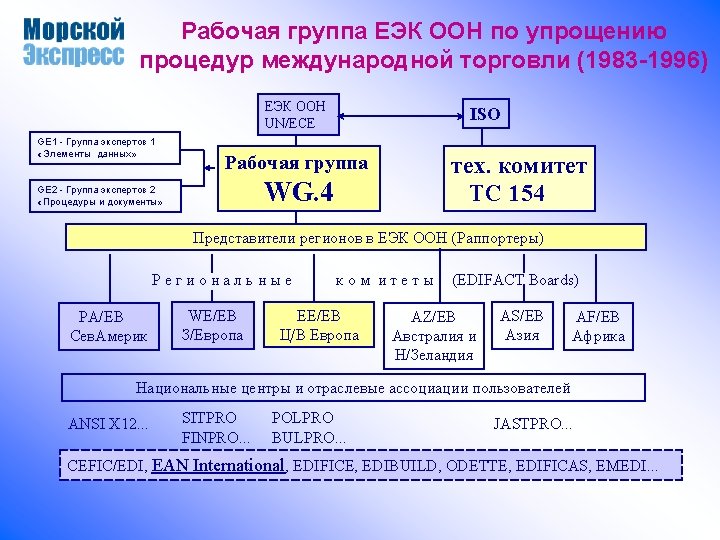 СЕФАКТ ООН (1997 – по н. в. ) Генеральная Ассамблея ООН ECOSOS Экономический и Социальный Совет ООН UN/ECE Европейская экономическая Комиссия ООН CEFACT - Центр по упрощению процедур и практики в управлении, торговле и на транспорте Группа управления CEFACT (CSG- CEFACT Steering Group) Permanent Working Groups Постоянные рабочие группы EDIFACT EWG Joint Syntax Working Group (JSWG) ISO/ TC 154 X 12 Business and Information Modelling Group (BIM) X 12 Strategic Implementation Task Group (SITG) Ad hoc Working Groups Целевые рабочие группы WG Simple EDI Working Group SIMAC Technical and Methodologies TMWG http: //www. harbinger. com/resource/klaus/tmwg
