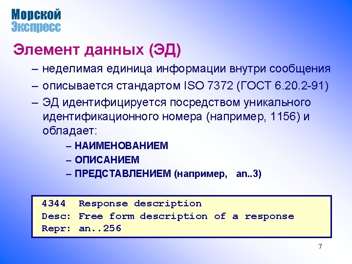 Фрагмент спецификации ЭД -----------------------------------1000 Document name Desc: Name of a document. Repr: an. . 35 -----------------------------------1001 Document name code Desc: Code specifying the document name. Repr: an. . 3 -----------------------------------1004 Document identifier Desc: To identify a document. Repr: an. . 35 -----------------------------------1049 Message section code Desc: Code specifying a section of a message. Repr: an. . 3 -----------------------------------1050 Sequence position identifier Desc: To identify a position in a sequence. Repr: an. . 10 -----------------------------------1052 Message item identifier Desc: To identify an item within a message. 9 Repr: an. . 35 -----------------------------------
