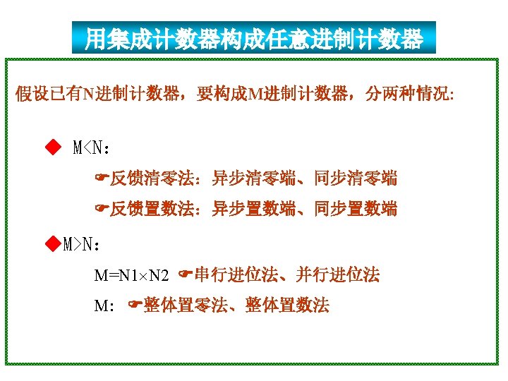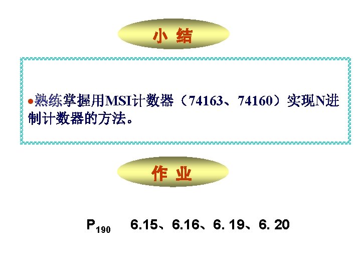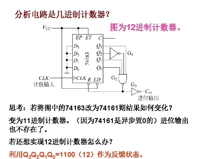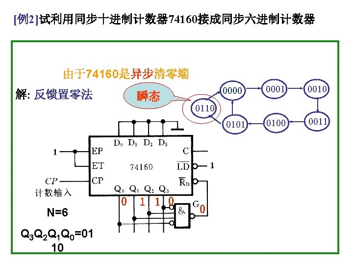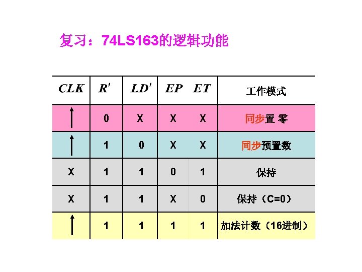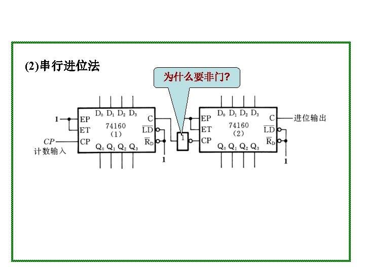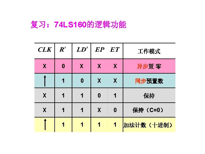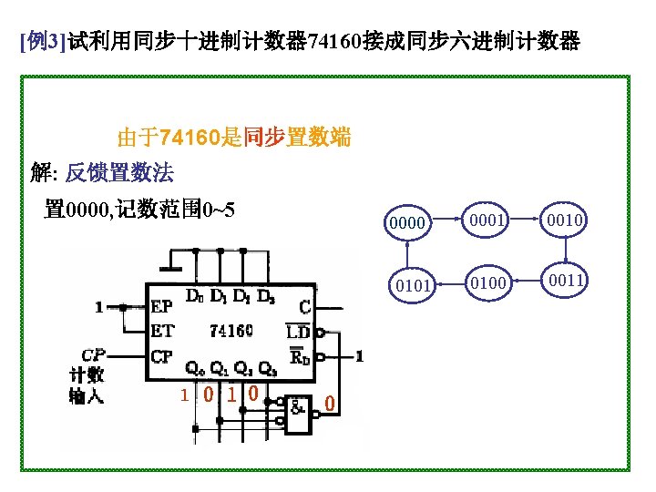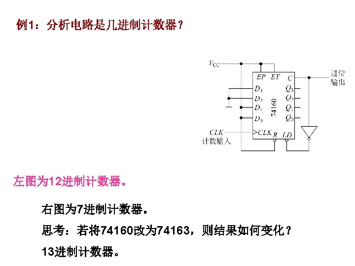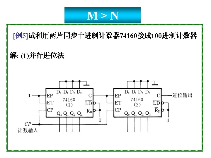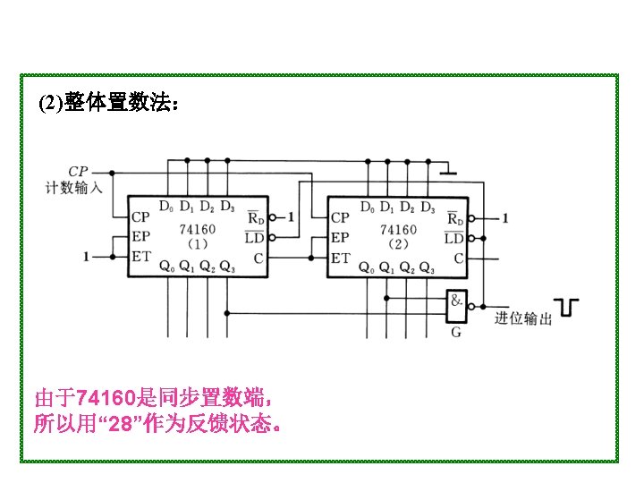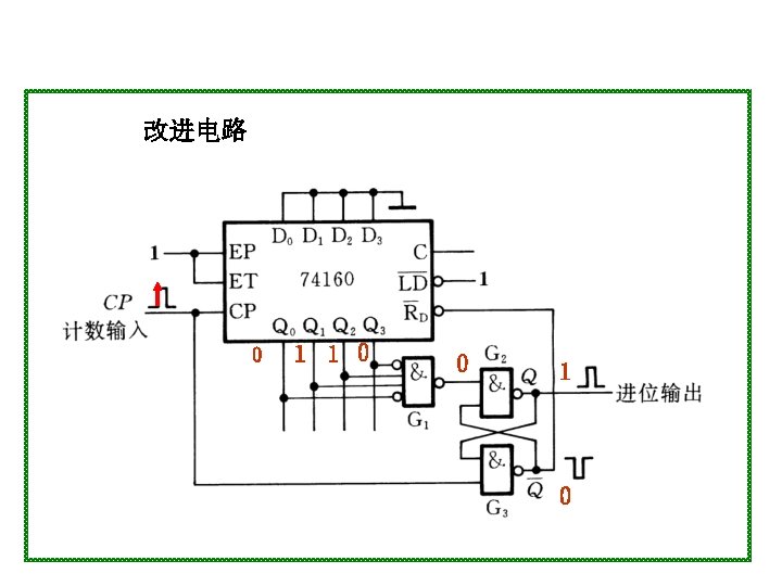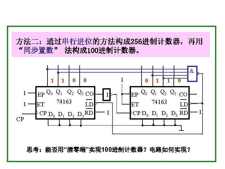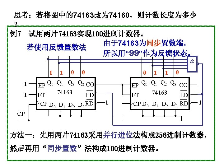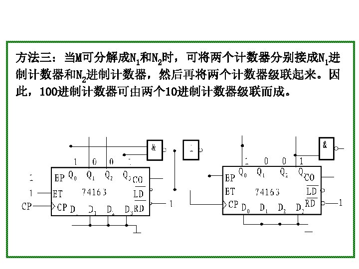 1001 0000 0001 0010 1001 904 0100 4 Slides: 20 Download presentation 1001 0000 0001 0010 置 1001, 记数范围 9、0~4 0100 例4 采用“反馈置数法”,用 74163构成十进制加计数器 1010 1011 1100 1101 1110 1111 由于74163 是同步置数 端 0000 0001 0010 0011 0100 1001 1000 0111 0110 0101 1 EP 1 ET CP 0 0 1 Q 0 Q 1 0 Q 2 Q 3 CO 74163 D 0 D 1 D 2 0 0 0 & LD D 3 RD 0 1 思考:校 验一下能 否自启动 另一种接法: 1 Q 0 1 1 Q 2 Q 3 CO 74163 LD 1 EP 1 ET CP D 0 D 1 D 2 D 3 RD CP 0 1101 1 1110 1 1111 1100 1011 1010 1001 1 1 0 0110 0101 0100 0111 0000 0011 1000 0001 0010