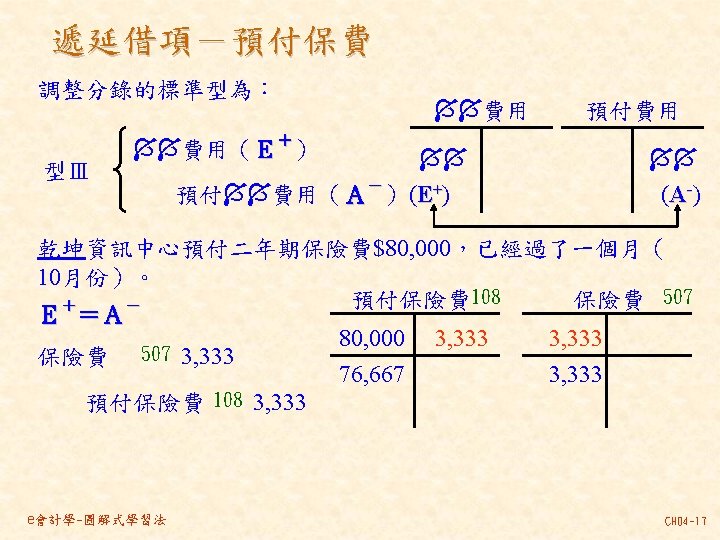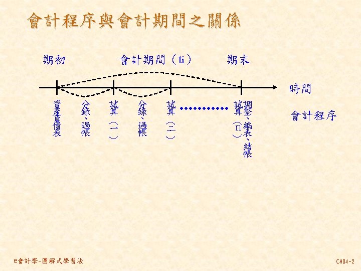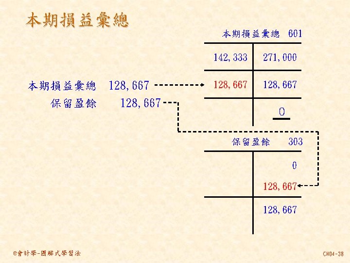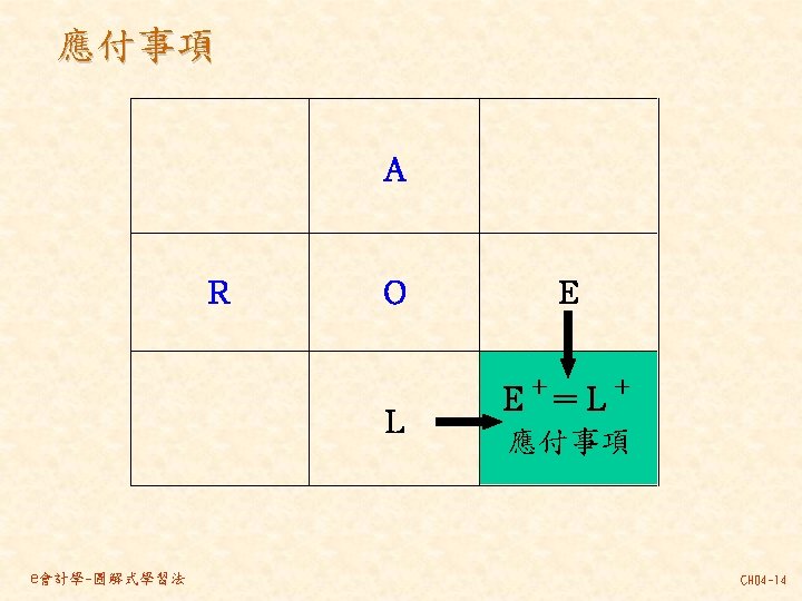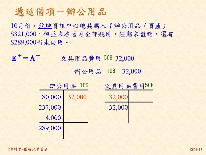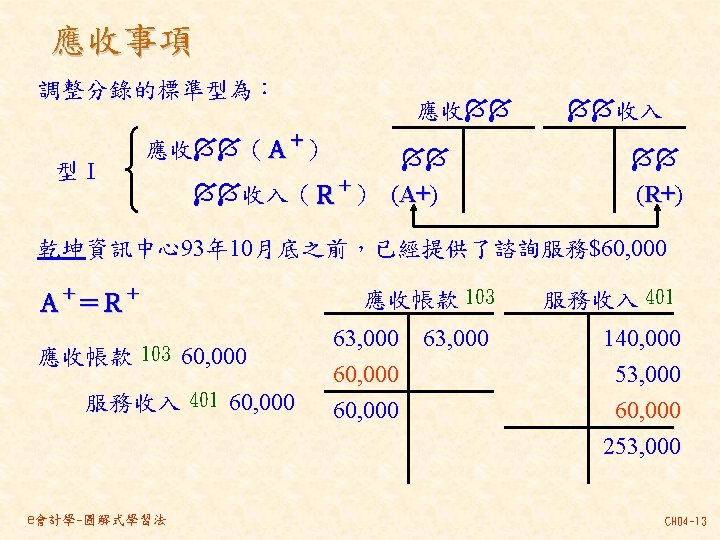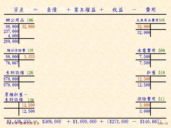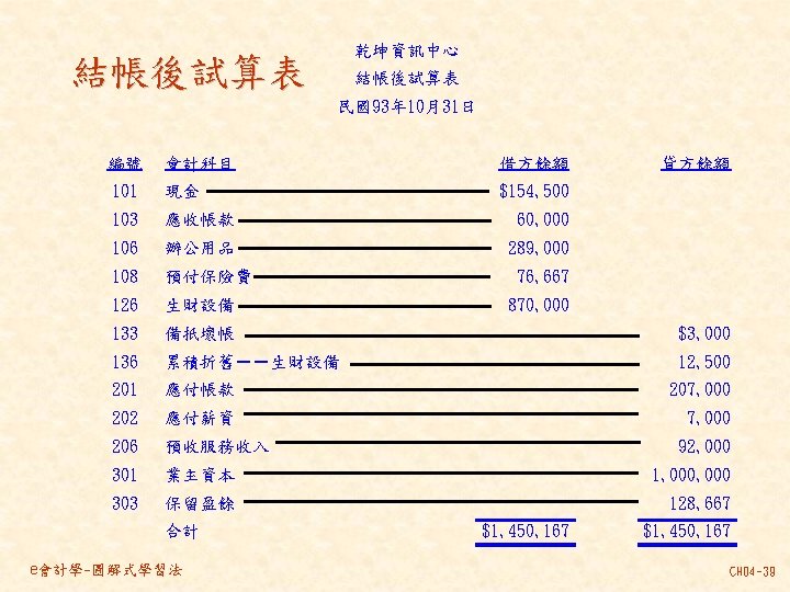 101 201 1 000 80 000 30 000 Slides: 46 Download presentation 分類帳(調整後餘額) 資產 = 現金 101 負債 + 業主權益 + 應付帳款 201 1, 000 80, 000 30, 000 237, 000 140, 000 870, 000 207, 000 63, 000 35, 000 10, 000 21, 000 30, 000 80, 000 4, 000 應付薪資 202 7, 500 7, 000 21, 000 154, 500 7, 000 應收帳款 103 預收服務收入 206 63, 000 60, 000 8, 000 100, 000 92, 000 業主資本 301 1, 000, 000 收益 - 服務收入 401 費用 薪資費用 502 140, 000 21, 000 53, 000 21, 000 60, 000 7, 000 8, 000 49, 000 261, 000 租金收入 402 房租費用 504 10, 000 35, 000 保險費用 507 3, 333 備抵壞帳 133 3, 000 e會計學-圖解式學習法 CH 04 -24 乾坤資訊中心 作底稿 93年 10月 調整前試算表 調整分錄 調整後試算表 科目 科目名稱 代號 借方 貸方 101 現金 154, 500 103 應收帳款 0 (a)60, 000 106 辦公用品 321, 000 (d)32, 000 289, 000 108 預付保險費 80, 000 (c) 3, 333 76, 667 126 生財設備 870, 000 201 應付帳款 207, 000 206 預收服務收入 100, 000 (g) 8, 000 92, 000 301 業主資本 1, 000, 000 (a)60, 000 401 服務收入 193, 000 261, 000 (g) 8, 000 403 租金收入 10, 000 502 薪資費用 42, 000 (b) 7, 000 49, 000 504 房租費用 35, 000 509 水電費用 7, 500 202 應付薪資 (b) 7, 000 507 保險費用 (c) 3, 333 508 文具用品費用 (d)32, 000 510 折舊 (e)12, 500 511 壞帳 (f) 3, 000 136 累積折舊 (e)12, 500 133 備抵壞帳 (f) 3, 000 合計 1, 510, 000 125, 833 1, 592, 500 本期損益 合計 作底稿 e會計學-圖解式學習法 損益表 借方 貸方 資產負債表 借方 貸方 154, 500 60, 000 289, 000 76, 667 870, 000 207, 000 92, 000 1, 000 261, 000 10, 000 49, 000 35, 000 7, 500 7, 000 3, 333 32, 000 12, 500 3, 000 140, 667 128, 667 271, 000 12, 500 3, 000 271, 000 1, 450, 167 1, 321, 500 128, 667 271, 000 1, 450, 167 CH 04 -46