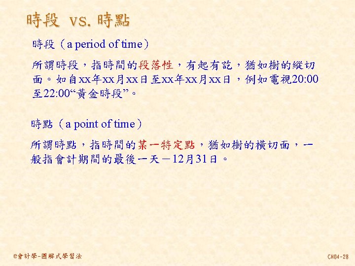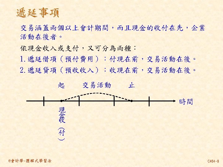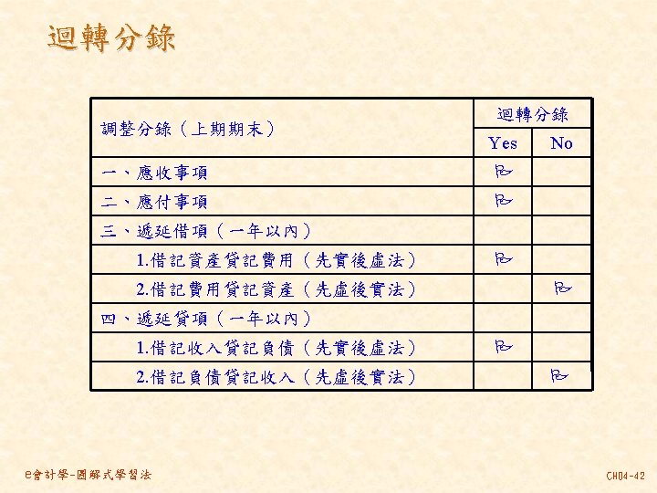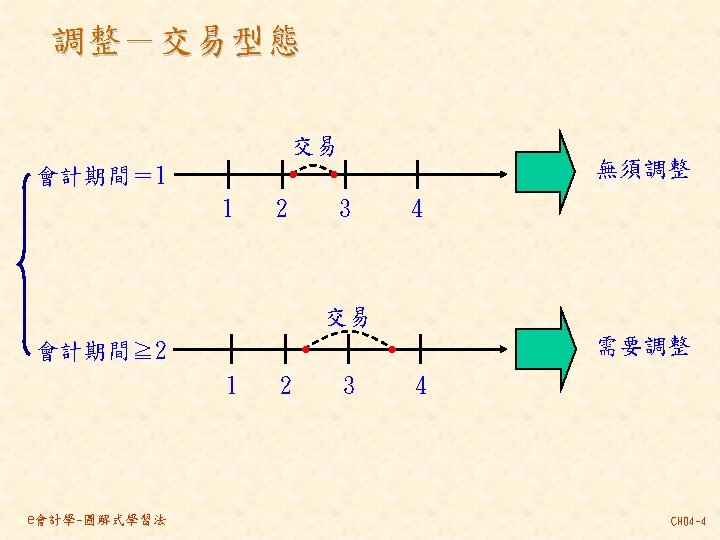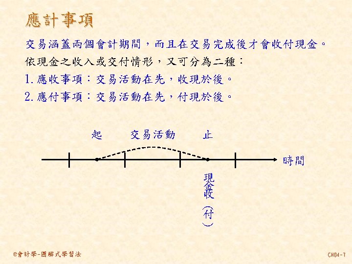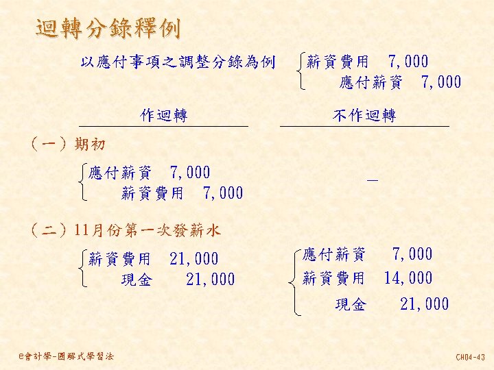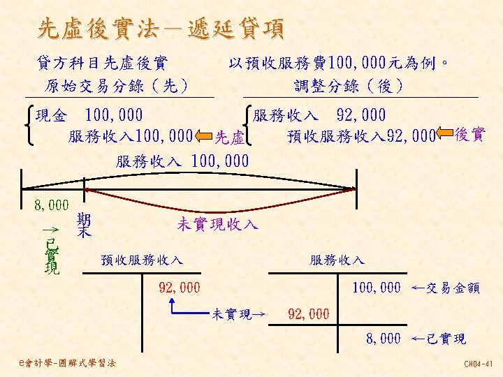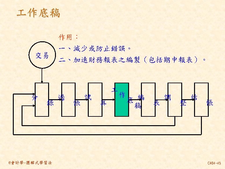 101 201 1 000 80 000 30 000 Slides: 46 Download presentation 分類帳(調整後餘額) 資產 = 現金 101 負債 + 業主權益 + 應付帳款 201 1, 000 80, 000 30, 000 237, 000 140, 000 870, 000 207, 000 63, 000 35, 000 10, 000 21, 000 30, 000 80, 000 4, 000 應付薪資 202 7, 500 7, 000 21, 000 154, 500 7, 000 應收帳款 103 預收服務收入 206 63, 000 60, 000 8, 000 100, 000 92, 000 業主資本 301 1, 000, 000 收益 - 服務收入 401 費用 薪資費用 502 140, 000 21, 000 53, 000 21, 000 60, 000 7, 000 8, 000 49, 000 261, 000 租金收入 402 房租費用 504 10, 000 35, 000 保險費用 507 3, 333 備抵壞帳 133 3, 000 e會計學-圖解式學習法 CH 04 -24 乾坤資訊中心 作底稿 93年 10月 調整前試算表 調整分錄 調整後試算表 科目 科目名稱 代號 借方 貸方 101 現金 154, 500 103 應收帳款 0 (a)60, 000 106 辦公用品 321, 000 (d)32, 000 289, 000 108 預付保險費 80, 000 (c) 3, 333 76, 667 126 生財設備 870, 000 201 應付帳款 207, 000 206 預收服務收入 100, 000 (g) 8, 000 92, 000 301 業主資本 1, 000, 000 (a)60, 000 401 服務收入 193, 000 261, 000 (g) 8, 000 403 租金收入 10, 000 502 薪資費用 42, 000 (b) 7, 000 49, 000 504 房租費用 35, 000 509 水電費用 7, 500 202 應付薪資 (b) 7, 000 507 保險費用 (c) 3, 333 508 文具用品費用 (d)32, 000 510 折舊 (e)12, 500 511 壞帳 (f) 3, 000 136 累積折舊 (e)12, 500 133 備抵壞帳 (f) 3, 000 合計 1, 510, 000 125, 833 1, 592, 500 本期損益 合計 作底稿 e會計學-圖解式學習法 損益表 借方 貸方 資產負債表 借方 貸方 154, 500 60, 000 289, 000 76, 667 870, 000 207, 000 92, 000 1, 000 261, 000 10, 000 49, 000 35, 000 7, 500 7, 000 3, 333 32, 000 12, 500 3, 000 140, 667 128, 667 271, 000 12, 500 3, 000 271, 000 1, 450, 167 1, 321, 500 128, 667 271, 000 1, 450, 167 CH 04 -46
