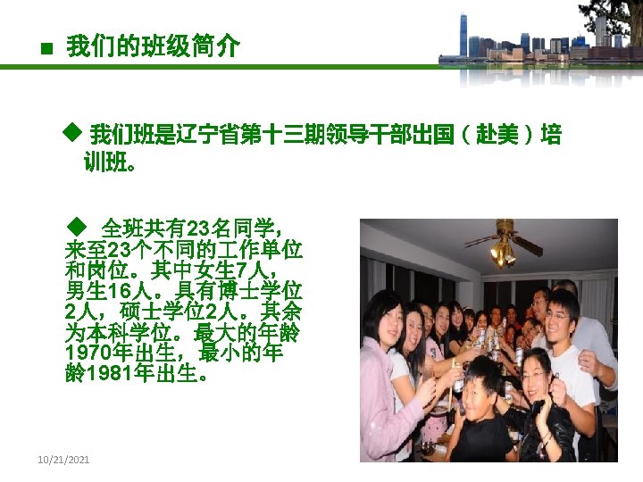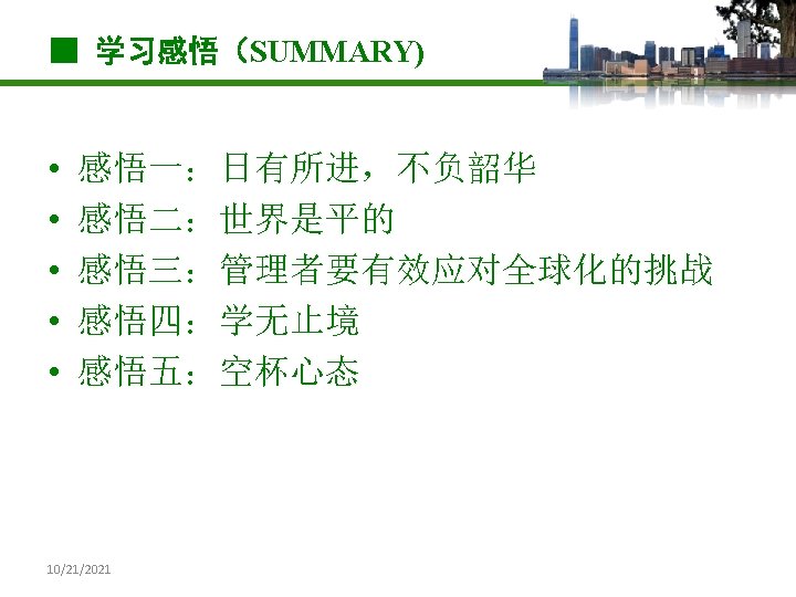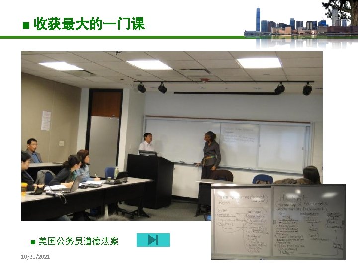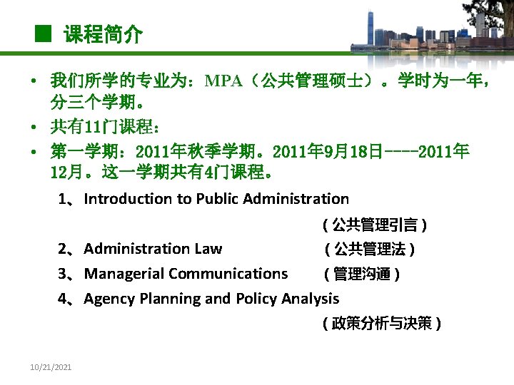 ■ 课程简介 • 第二学期: 2012年春季学期。2012年 1月8日---2012年 5月。这一学期 共有5门课程。 5、Complex Organization (复杂组织学) 6、Seminar in Public Management (公共管理论坛) 7、Public Personnel Administration (人力资源管理) 8、Public Management Strategies for the 21 st Cen (公共管理在 21世纪) 9、Special Topics: Tools of the Social Change Agent (社会变革的 具) • 第三期: 2012年夏季学期。2012年 5月---2012年 7月28日。这一学期共 有2门课程。 10、Principles and Practices of Public Finance(公共财政原理与实践) 11、Practicum in Policy Analysis (政策分析与实践)---论文 10/21/2021
