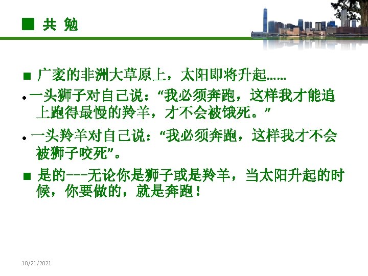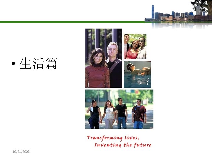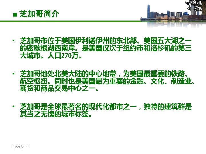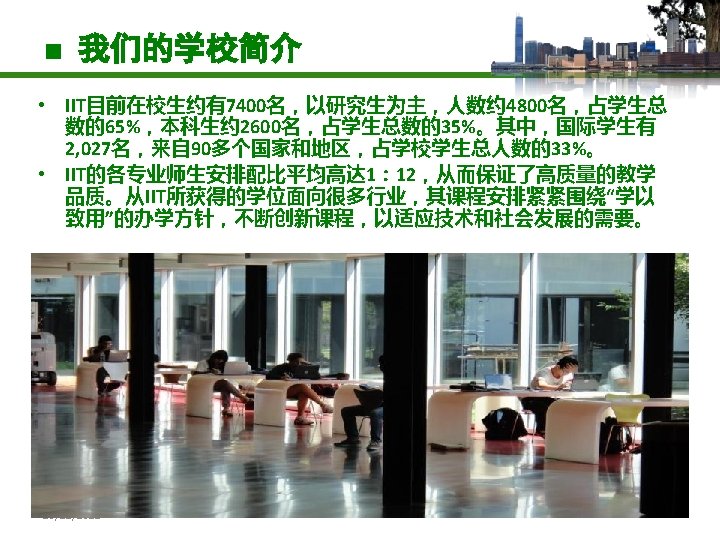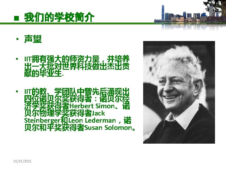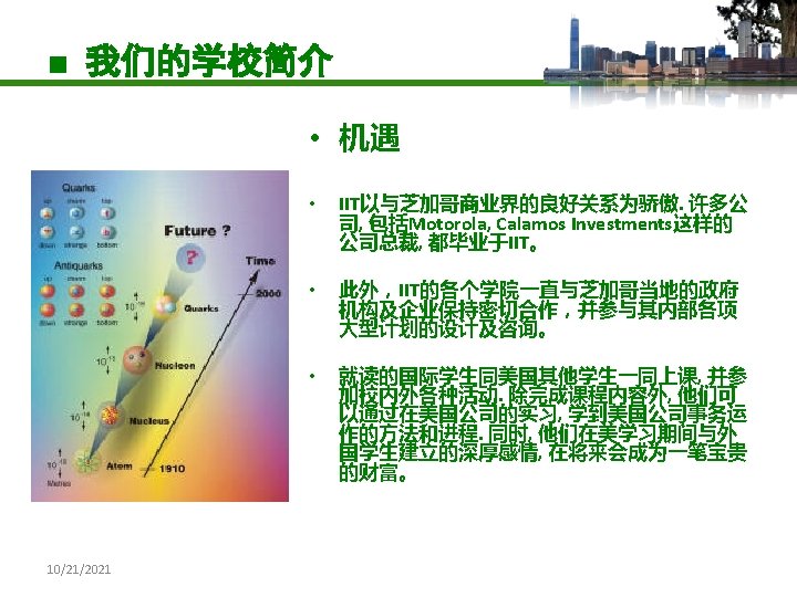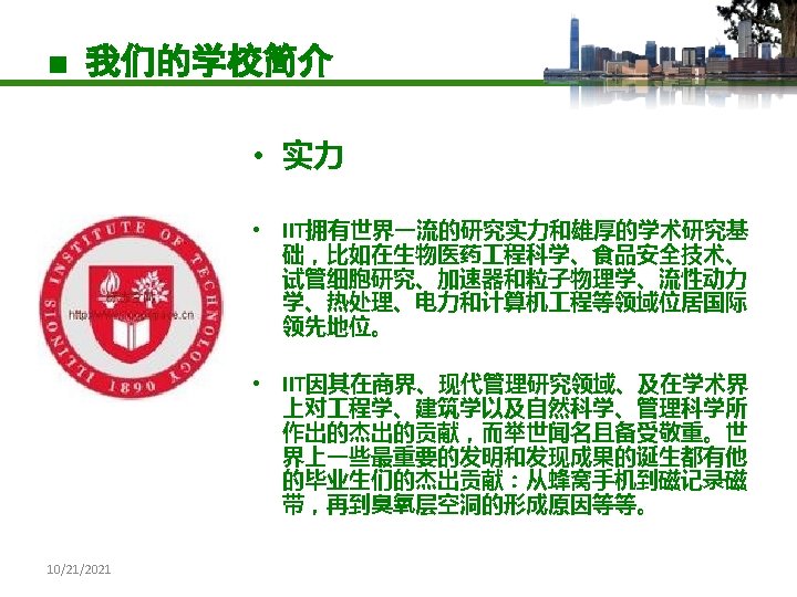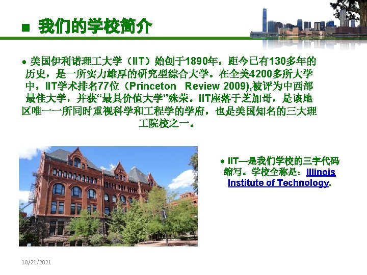 ■ 我们的学校简介 • IIT‘S MISSION 学校愿景 • To advance knowledge through research and scholarship, to cultivate invention improving the human condition, and to educate students from throughout the world for a life of professional achievement, service to society, and individual fulfillment. 10/21/2021