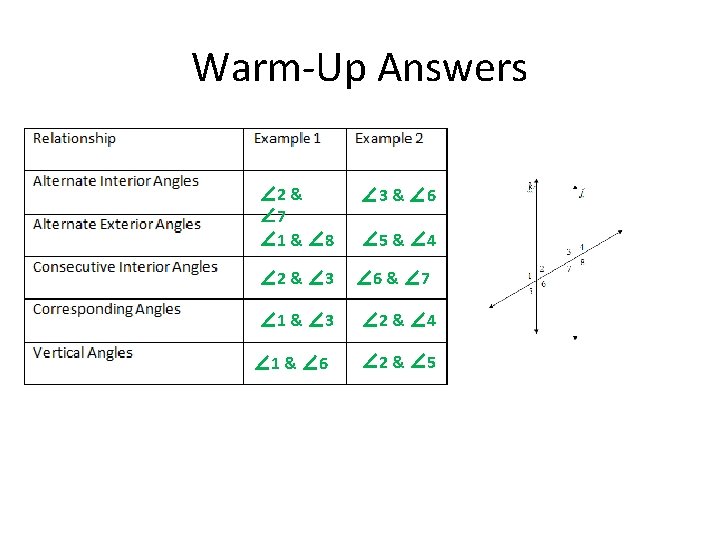 Warm-Up Answers Vertical Angles 6 and 10 ------ Same-Side Interior Angles Corresponding Angles Alternate Exterior Angles Corresponding Angles Same-Side Interior Angles Vertical Angles Linear Pair Can you identify the old angle-pairs we have learned?