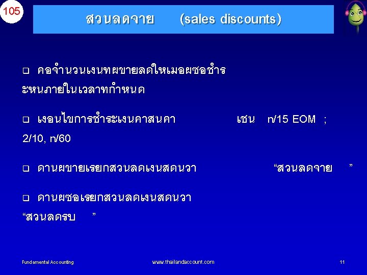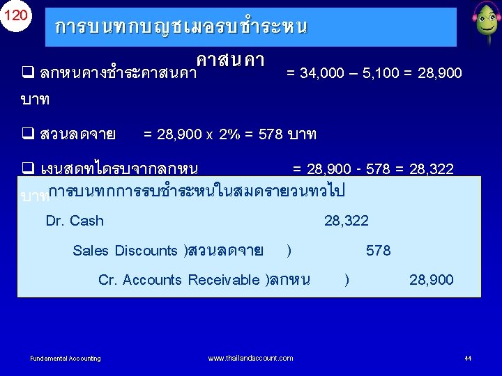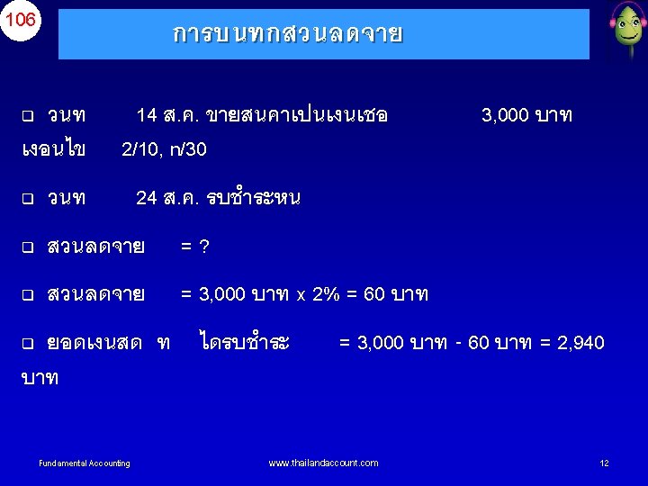 106 การบนทกสวนลดจาย Dr. Cash )เงนสด ( Sales Discounts )สวนลดจาย ( Cr. Accounts Receivable (ลกหน Acc. Rec. Fundamental Accounting 3, 000 Sales 14) 3, 000 Cash xx 24)2, 940 ( 2, 940 160 14) 3, 000 Sales Discounts 24)160 www. thailandaccount. com 13