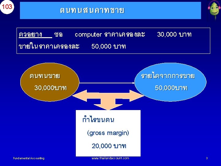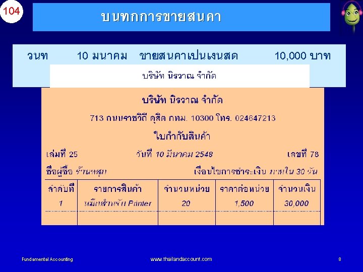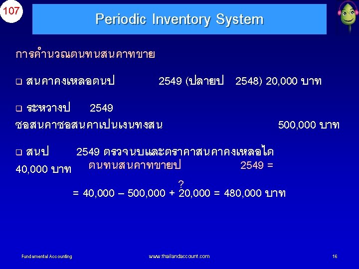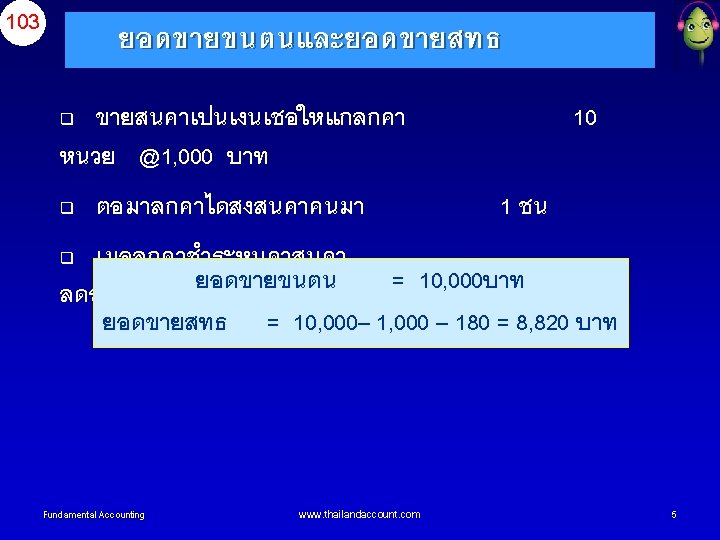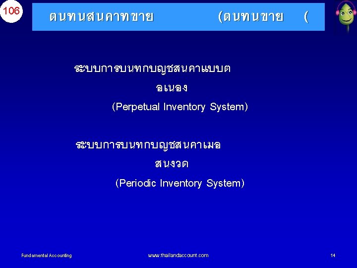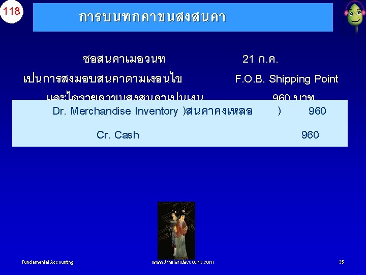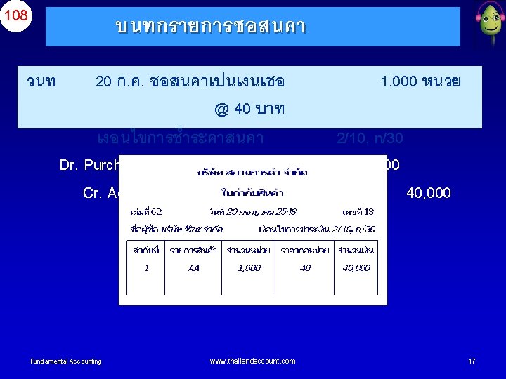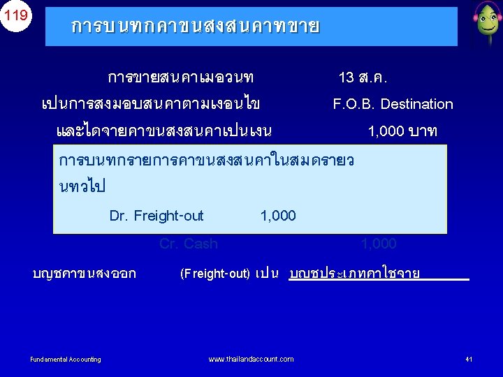 108 คาขนสงสนคา (Transportation Cost) เงอนไขการสงมอบสนคา q F. O. B. Shipping Point q F. O. B. Destination Fundamental Accounting www. thailandaccount. com 18