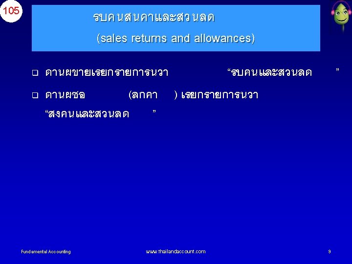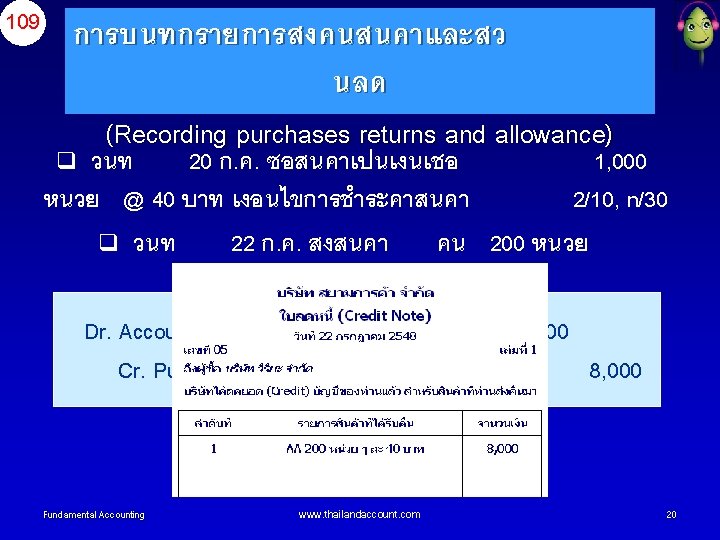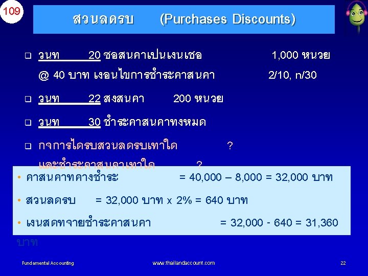 109 การบนทกรายการสงคนสนคาและสว นลด (Recording purchases returns and allowance) q วนท 20 ซอสนคาเปนเงนเชอ 1, 000 หนวย @ 40 บาท q วนท 22 ก. ค. สงสนคา คน 200 หนวย Accounts Payable Purchases 22) 8, 000 20) 40, 000 Purchases Returns 22) 8, 000 Fundamental Accounting www. thailandaccount. com 21