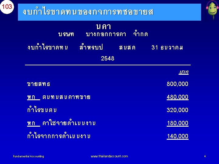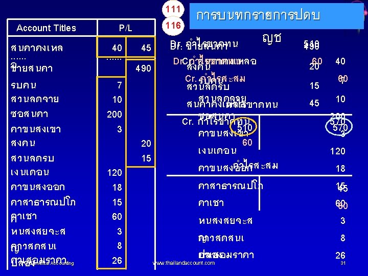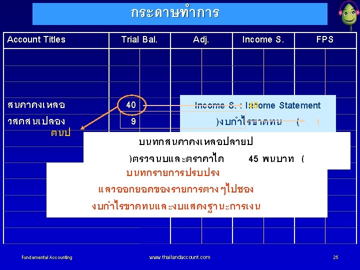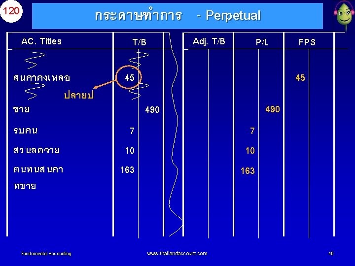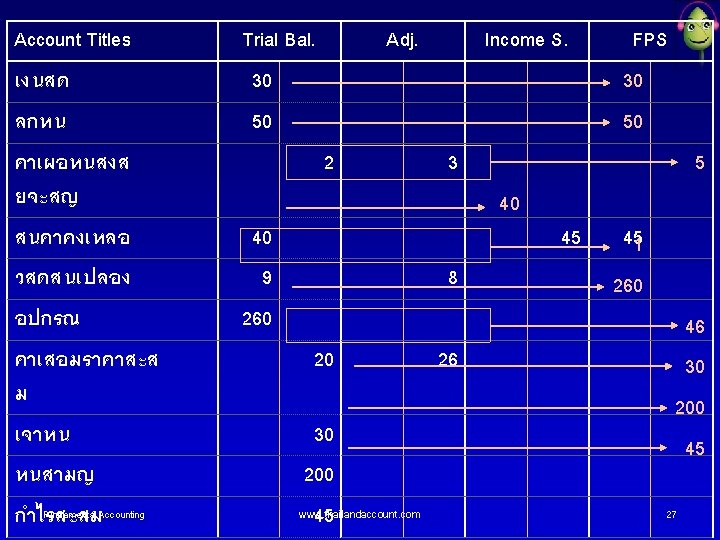 Account Titles ขาย รบคน สวนลดจาย ซอสนคา คาขนสงเขา สงคน สวนลดรบ เงนเดอน คาขนสงออก คาสาธารณปโภค Fundamental Accounting Trial Bal. 490 7 10 200 3 20 15 120 18 15 Adj. www. thailandaccount. com Income S. 490 7 10 200 3 20 15 120 18 15 FPS 28