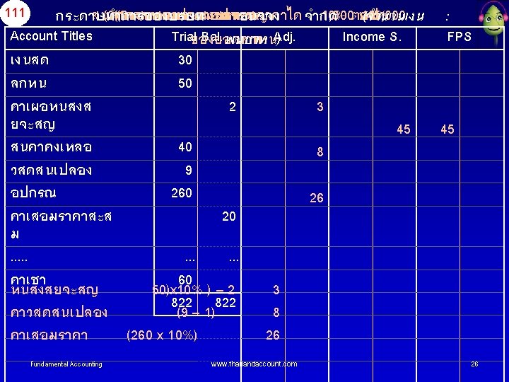 Account Titles คาเชา หนสงสยจะสญ คาวสดสนเปลอง คาเสอมราคา Trial Bal. 60 822 Adj. 3 8 26 37 กำไรสทธ (510 – 570) Fundamental Accounting www. thailandaccount. com 37 Income S. 60 3 8 26 510 60 570 FPS 570 386 326 60 386 29