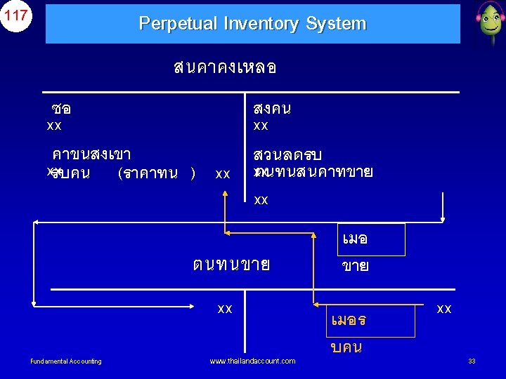 สรปการบนทกตนทนสนคาตามระบบ Periodic Inventory xx Purchases xx Transportation-in xx Purchases Returns xx Purchases Discounts xx Fundamental Accounting www. thailandaccount. com 32