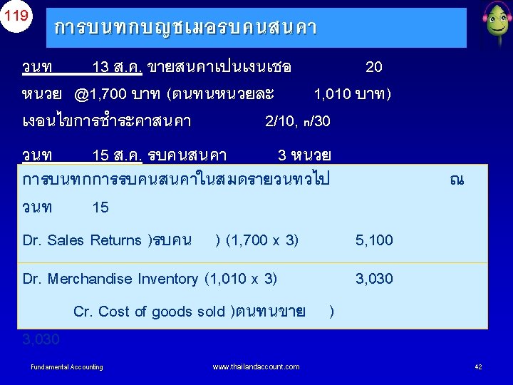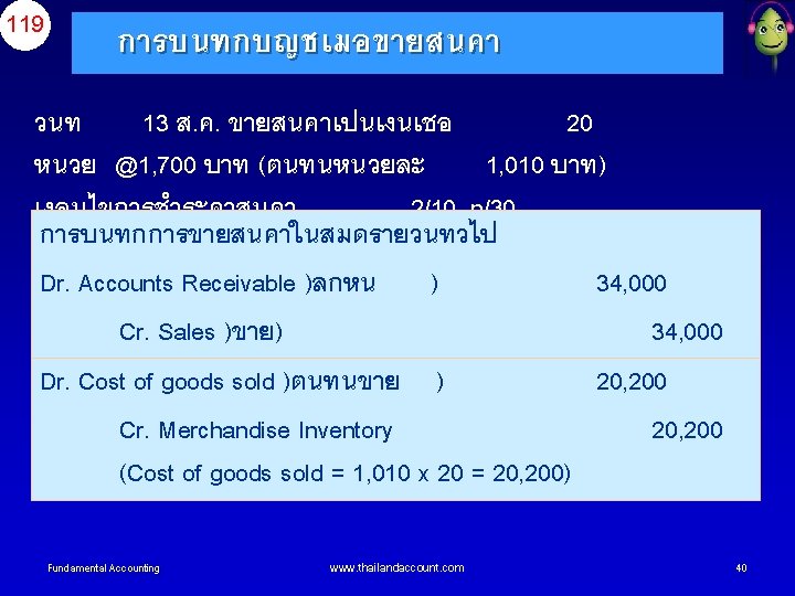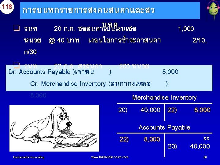 การบนทกสวนลดรบ Cash xx 30) 31, 360 Merchandise Inventory 20) 40, 000 22) 8, 000 30) 640 Dr. Accounts Payable 32, 000 Cr. Merchandise Inventory 640 Cash 31, 360 Accounts Payable 22) 8, 000 20) 40, 000 30) 32, 000 Fundamental Accounting www. thailandaccount. com 39