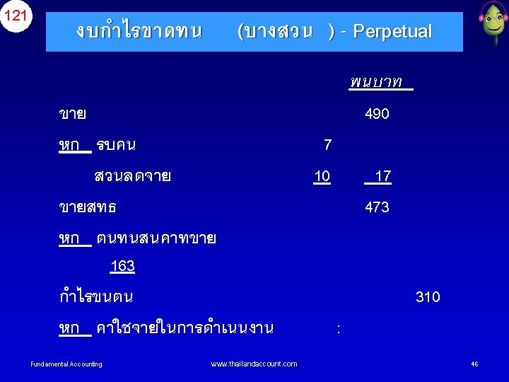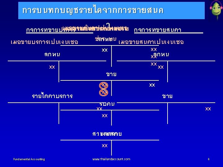 สวนลดรบ (Purchases Discounts) คาสนคาทคางชำระ 32, 000 บาท สวนลดรบ 640 บาท จายชำระคาสนคา 31, 360 บาท Accounts Payable Purchases 22) 8, 000 20) 40, 000 30) 32, 000 20) 40, 000 Cash xx 30) 31, 360 Fundamental Accounting www. thailandaccount. com Purchases Returns 22) 8, 000 Purchases Discounts 30) 640 24