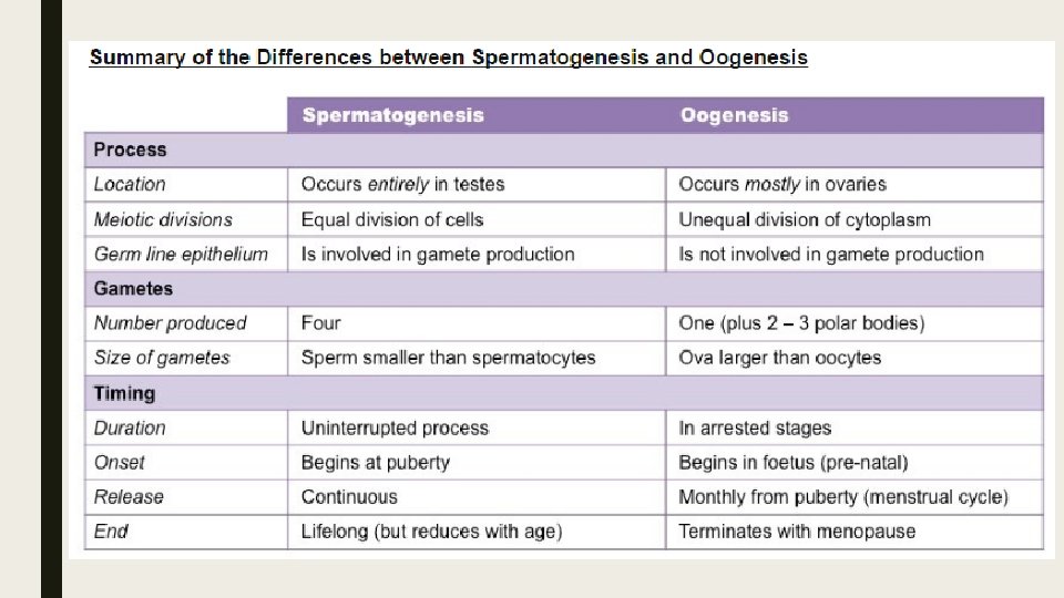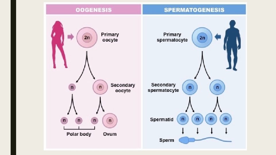 Gametogenesis ■ In gametogenesis, many gametes are produced, although relatively few of them are ever used in reproduction. ■ The process of gamete formation in testes and ovaries have a common sequence of phases. ■ 1 st: there is a multiplication phase in which the gamete mother cells divide by mitotic cell division. ■ 2 nd- each developing sex cell undergoes a growth phase. ■ 3 rd – comes the maturation phase. This involves meiosis and results in the formation of haploid gametes.