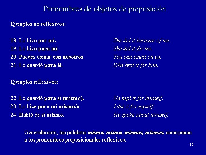 Pronombres de objetos de preposición Ejemplos no-reflexivos: 18. Lo hizo por mí. 19. Lo hizo para mí. 20. Puedes contar con nosotros. 21. Lo guardó para él. She did it because of me. She did it for me. You can count on us. S/he kept it for him. Ejemplos reflexivos: 22. Lo guardó para sí (mismo). 23. Lo hice para mí mismo/a. 24. Habló de sí mismo. He kept it for himself. I did it for myself. He spoke about himself. Generalmente, las palabras mismo, misma, mismos, mismas, acompañan a los pronombres preposicionales reflexivos. 17
