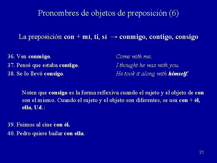 Pronombres de objetos de preposición (6) La preposición con + mí, ti, sí → conmigo, contigo, consigo 36. Ven conmigo. 37. Pensé que estaba contigo. 38. Se lo llevó consigo. Come with me. I thought he was with you. He took it along with himself. Noten que consigo es la forma reflexiva cuando el sujeto y el objeto de con son el mismo. Cuando el sujeto y el objeto son diferentes, se usa con + él, ella, Ud. : 39. Fuimos al cine con él. 40. Pedro quiere bailar con ella. 21
