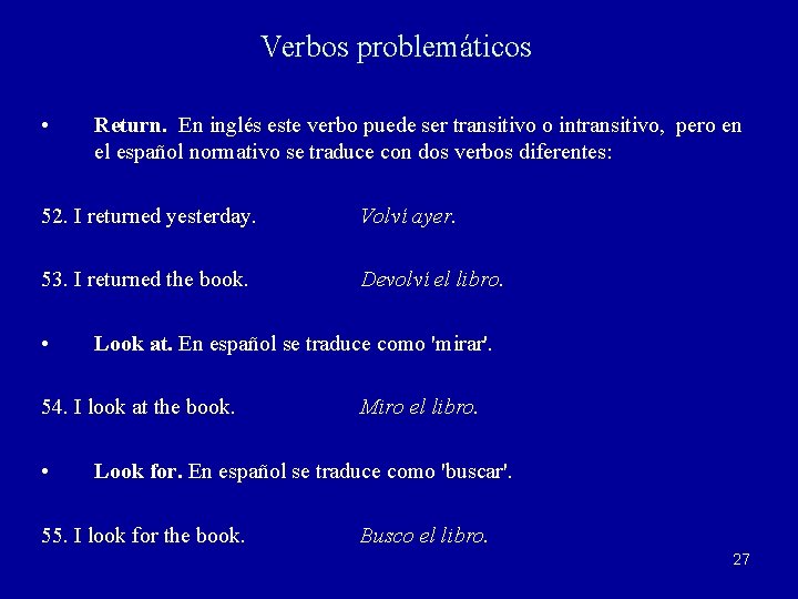 Verbos problemáticos • Return. En inglés este verbo puede ser transitivo o intransitivo, pero en el español normativo se traduce con dos verbos diferentes: 52. I returned yesterday. Volví ayer. 53. I returned the book. Devolví el libro. • Look at. En español se traduce como 'mirar'. 54. I look at the book. • Miro el libro. Look for. En español se traduce como 'buscar'. 55. I look for the book. Busco el libro. 27