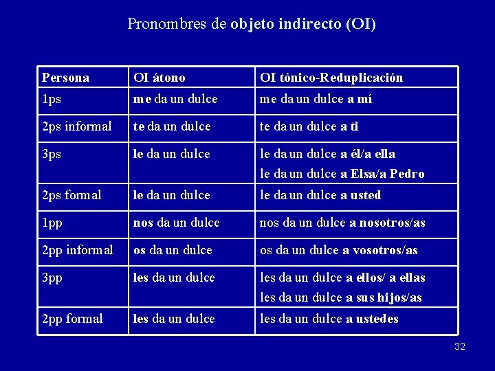 Pronombres de objeto indirecto (OI) Persona OI átono OI tónico-Reduplicación 1 ps me da un dulce a mí 2 ps informal te da un dulce a ti 3 ps le da un dulce a él/a ella le da un dulce a Elsa/a Pedro 2 ps formal le da un dulce a usted 1 pp nos da un dulce a nosotros/as 2 pp informal os da un dulce a vosotros/as 3 pp les da un dulce a ellos/ a ellas les da un dulce a sus hijos/as 2 pp formal les da un dulce a ustedes 32