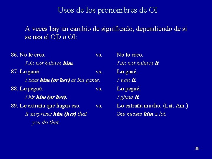 Usos de los pronombres de OI A veces hay un cambio de significado, dependiendo de si se usa el OD o OI: 86. No le creo. vs. I do not believe him. 87. Le gané. vs. I beat him (or her) at the game. 88. Le pegué. vs. I hit him (or her). 89. Le extraña que hagas eso. vs. It surprises him (her) that you do that. No lo creo. I do not believe it Lo gané. I won it. Lo pegué. I glued it. Lo extraña mucho. (Lat. Am. ) She misses him a lot. 38
