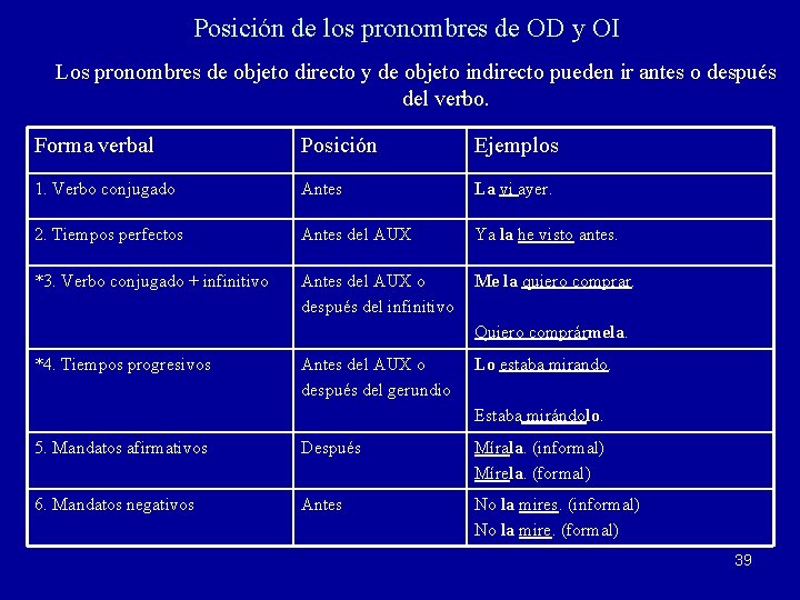 Posición de los pronombres de OD y OI Los pronombres de objeto directo y de objeto indirecto pueden ir antes o después del verbo. Forma verbal Posición Ejemplos 1. Verbo conjugado Antes La vi ayer. 2. Tiempos perfectos Antes del AUX Ya la he visto antes. *3. Verbo conjugado + infinitivo Antes del AUX o después del infinitivo Me la quiero comprar. Quiero comprármela. *4. Tiempos progresivos Antes del AUX o después del gerundio Lo estaba mirando. Estaba mirándolo. 5. Mandatos afirmativos Después Mírala. (informal) Mírela. (formal) 6. Mandatos negativos Antes No la mires. (informal) No la mire. (formal) 39
