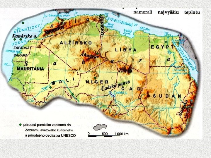 Príroda • najväčšiu časť zaberá púšť Sahara, ktorú tvoria tri typy púští: kamenistá (tvoria ju väčšinou holé skaly) štrková piesočná (vznikajú duny) • v púšti sa vyskytujú oázy – podzemná voda (studne) a pozostatky starých pohorí – Ahaggar, Tibesti • vrásové pohorie Atlas, dlhé vyše 2 000 km • oblasťou prechádza obratník Raka – suché a veľmi teplé tropické podnebie (miesta, kde namerali najvyššiu teplotu na Zemi a celé roky tam nezaprší) • na pobreží Stredozemného mora a pozdĺž rieky Níl – subtropická krajina
