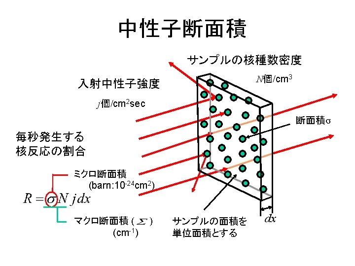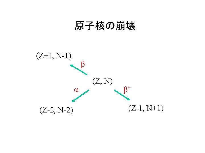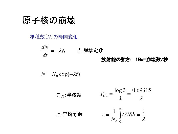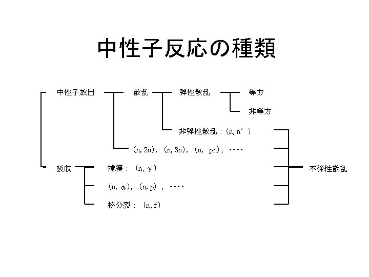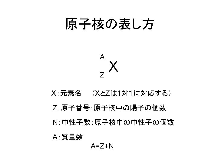 核反応(nuclear reaction) a b X Y a:入射粒子(incident particle) X:標的核(target nucleus) Y:残留核(residual nucleus) b:放出粒子(emitted particle) 注:aが無いときは崩壊(decay)と呼んでいる