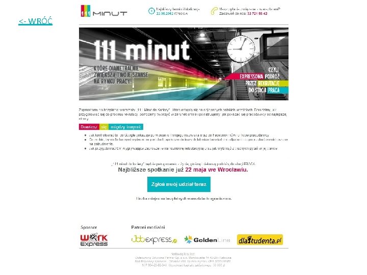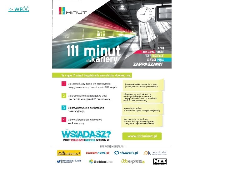 Promocja Strona internetowa www. 111 minut. pl Mailing do bazy Jobexpress. pl Plakat Ulotka Strony wydarzeń na Facebook Strony wydarzeń na Goldenline Promocja w tematycznych grupach na Goldenline. pl Wpisy w katalogach darmowych szkoleń Informacje publikowane na fanpage’u WE Biura Karier (info w newsletterze/ na stronie/ na fanpage’u) Informacje prasowe Wywiady podczas wydarzeń i informacje w serwisach (Radio Katowice, Planeta, RMF MAXX, ESKA)