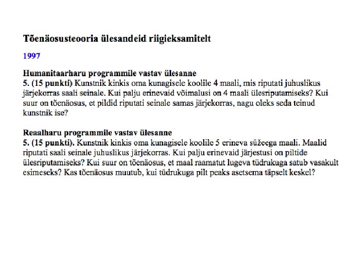 Ülesanded (IV) 7. Urnis on 3 valget ja 5 musta kuulikest. Võetakse järjest 3 kuulikest (neid tagasi panemata). Kui on teada, et valgeid kuulikesi ei saadud, kui suur on siis tõenäosus, et järgmise kuuli võtmisel saadakse siiski valge kuul? 8. Laual on kaardid numbritega 1, 2, 3, 4, 5. Väike Mall laob neist rea. Kui palju on erinevaid võimalusi? Kui suur on tõenäosus, et ta laob 5 -ga jaguva arvu?
