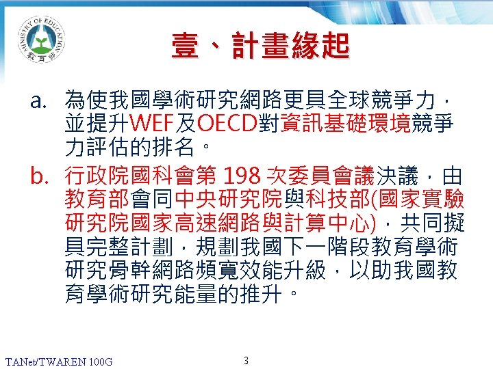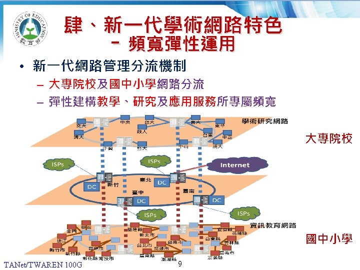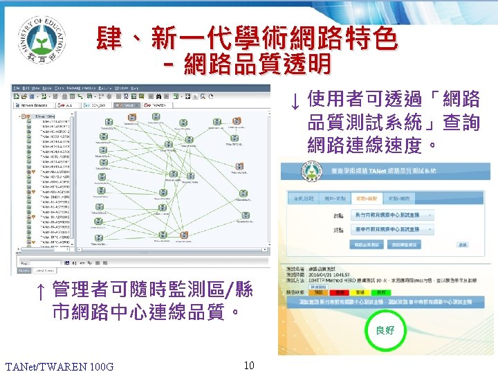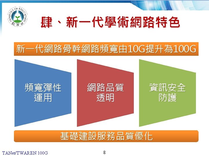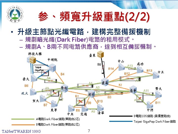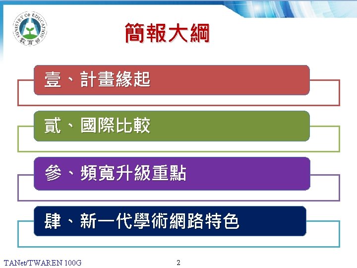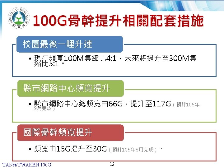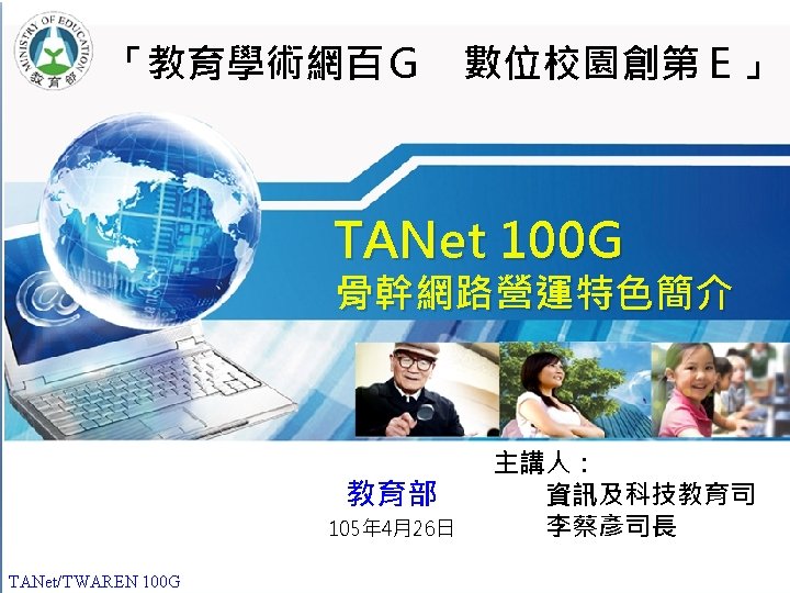 12 20062013 180 160 140 G 120 100 Slides: 13 Download presentation 貳、國際比較 (1/2) 2006年及2013年,各國學術網路骨幹頻寬比較 180 160 140 頻寬(G) 120 100 100 80 60 40 20 40 30 10 10 10 50 10 40 10 20 0 TANet/TWAREN Internet 2 CANARIE SINET KREONET SURFnet AARNet 臺灣 美國 加拿大 日本 南韓 荷蘭 澳洲 國家學術網路 2006 TANet/TWAREN 100 G 4 2013 貳、國際比較 (2/2) 2016年各國學術網路骨幹頻寬比較 180 160 頻寬(G) 140 120 100 100 100 TANet/TWAREN Internet 2 CANARIE SINET KREONET AARNet 臺灣 美國 加拿大 日本 南韓 澳洲 80 60 40 20 0 國家學術網路 TANet/TWAREN 100 G 5 2016 簡報完畢 敬請指教 TANet/TWAREN 100 G 13