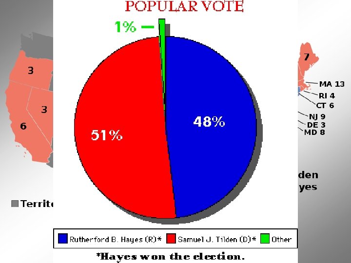 Republican Rutherford B. Hayes 4, 034, 311 47. 5% Party Candidate Popular Votes Democrat Samuel J. Tilden 4, 288, 546 51. 5% 165 Electoral Votes (185 needed) 184 ** 185 ** 20 Electoral Votes Disputed 184