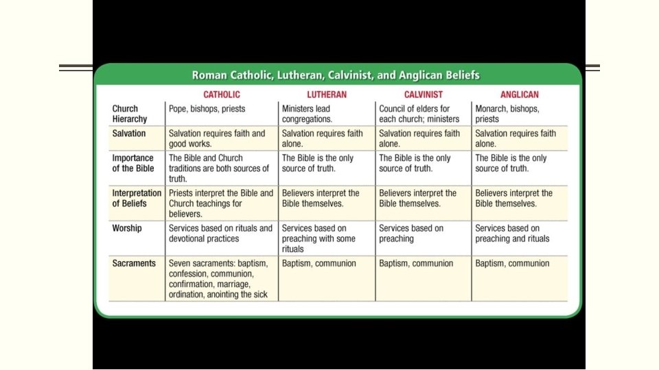 Anabaptists § How did the Anabaptists differ from other Protestant groups? § They believed in adult baptism § Why were the Anabaptists considered to be dangerous political radicals? § They believed in complete separation of the church and state (government) and that the state had no authority over real Christians. They refused to hold political office or bear arms.