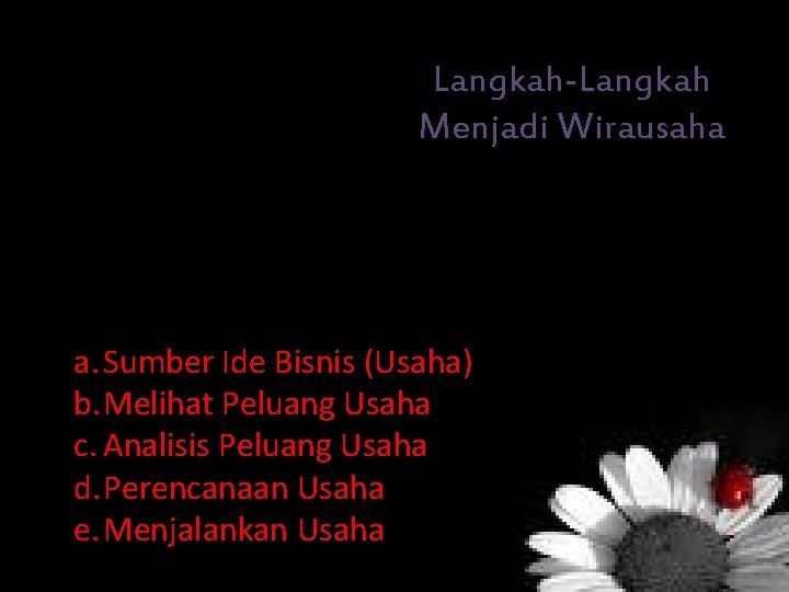 Langkah-Langkah Menjadi Wirausaha a. Sumber Ide Bisnis (Usaha) b. Melihat Peluang Usaha c. Analisis Peluang Usaha d. Perencanaan Usaha e. Menjalankan Usaha