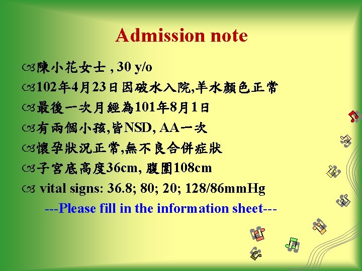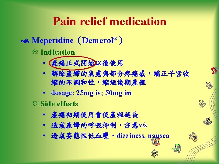Pain relief medication Tranquilizer help relieving anxiety may reduce FHR variation, e. g. Diazepam(valium) Narcotic analgesics Meperidine(Demerol®)最常用的麻醉性 鎮痛劑,作用時間持續3~ 4 hrs Fentanyl(Sublimaze®)