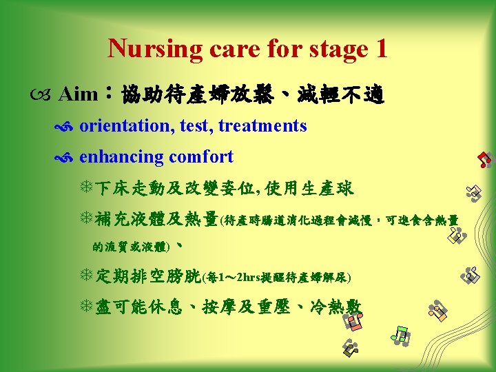 Nursing care for stage 1 引導呼吸運動 T 避免 hyperventilation (respiratory alkalosis)
