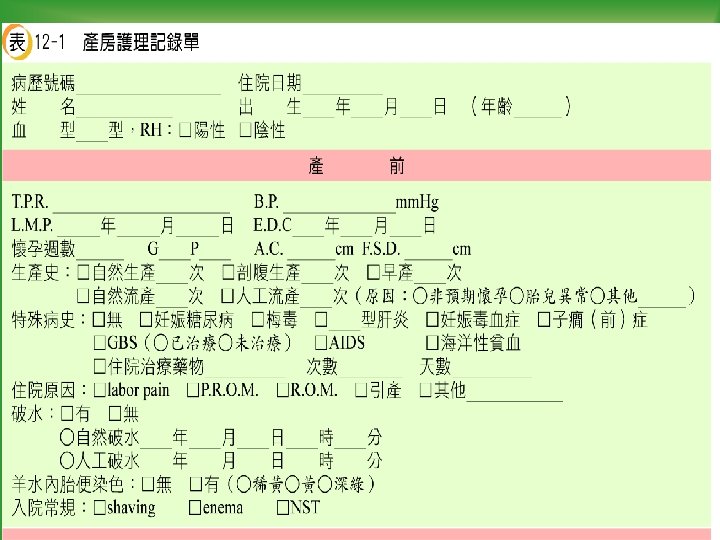 Stage one of labor Definition and time 潛伏期(0 -3 cm) 、活動期(4 -7 cm) 、過渡期(810 cm) Mother and fetus assessment Encourage father’s participation