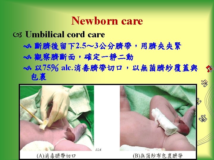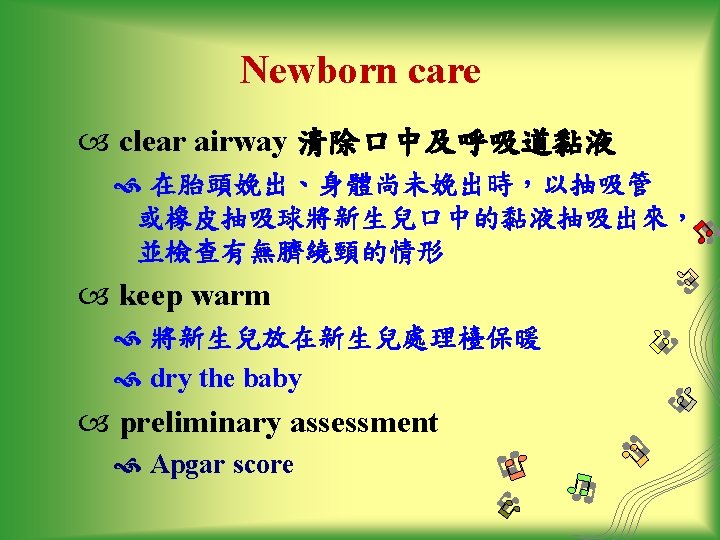 Apgar score 新生兒出生後1分鐘和5分鐘時 T 7~ 10: good兒的狀況良好, T 4~ 6: clear airway, O 2 supply and further observation T 4 & under: need intensive care