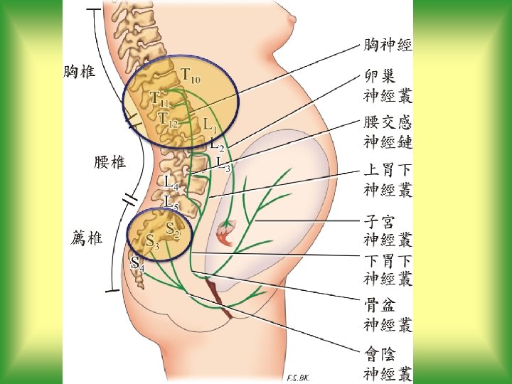 Pain transmission Fear anxiety and pain Labor pain and management Stage one of labor: T Uterus contraction, lower back and abdomen pain T pain transmission: from T 10~ 12, L 1 into spinal cord Stage two of labor: T Perineum area (會陰部) T Pain transmission: S 2~ 4