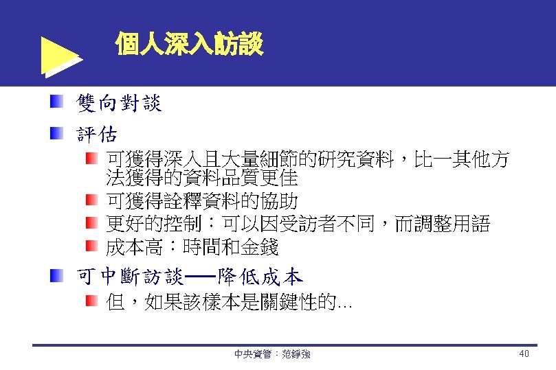 Types of Research Using IDIs 個人深入訪談 Oral histories Sequential interviewing Cultural interviews Types In-depth interviews Life histories Critical incident techniques Ethnography 中央資管:范錚強 38