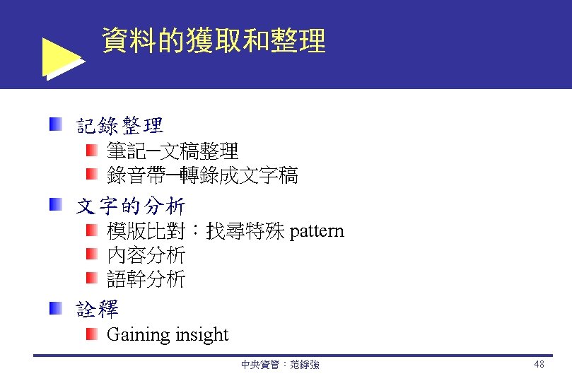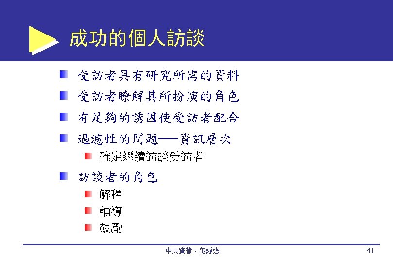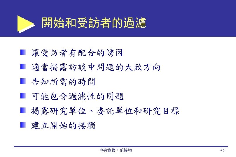 Requirements for Unstructured Interviews Developed dialog Probe for answers Distinctions Interviewer creativity Interviewer skill 中央資管:范錚強 35
