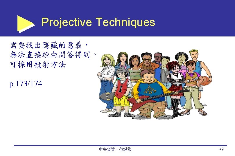 Projective Techniques Laddering Semantic Mapping Sensory sorts Component Sorts MET Data Collection Techniques Imagination Exercises 中央資管:范錚強 Association Sentence Completion Cartoons Thematic Apperception 39