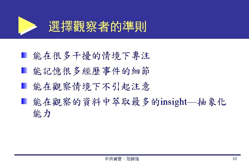 Using Observation Systematic planning Properly controlled Consistently dependable Accurate account of events 中央資管:范錚強 66