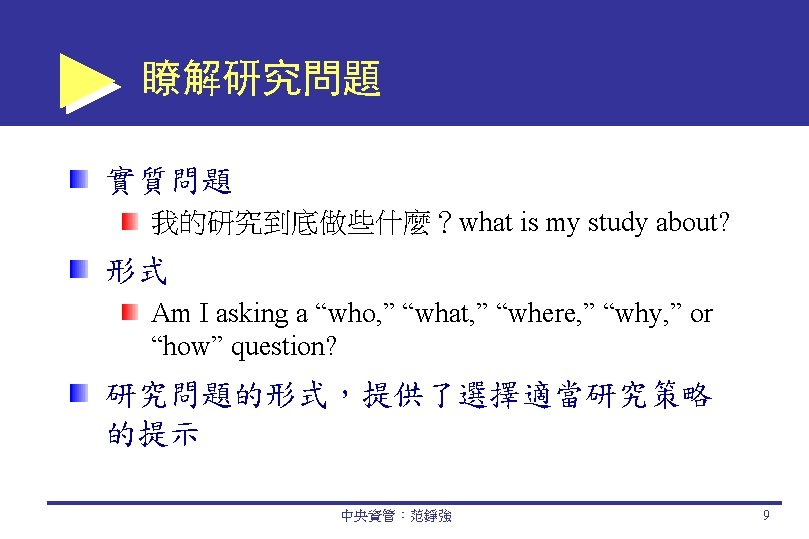 Distinction between Qualitative & Quantitative Theory Building Theory Testing 中央資管:范錚強 8